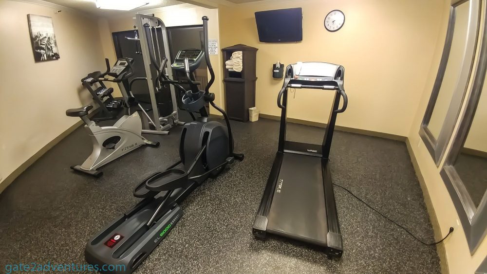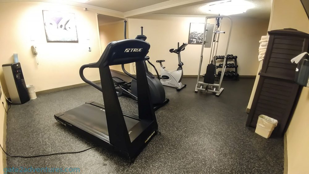 On the far side of the hotel is the fitness center. The room is close to the entrance all the way in the back of the upstairs parking lot. Sizewise, the fitness center is very small and has only a few pieces of workout equipment. You need your room key to access this place. In here the hotel also stores the towels for the pool.
