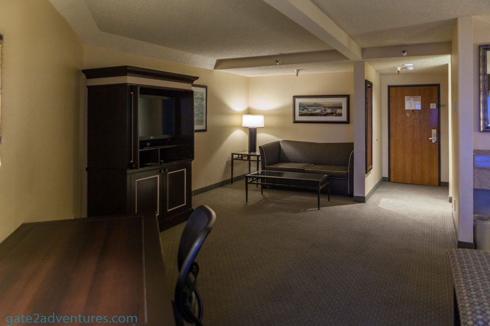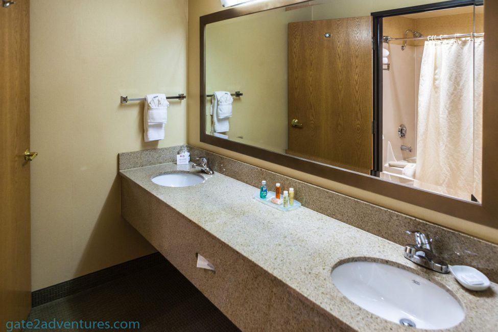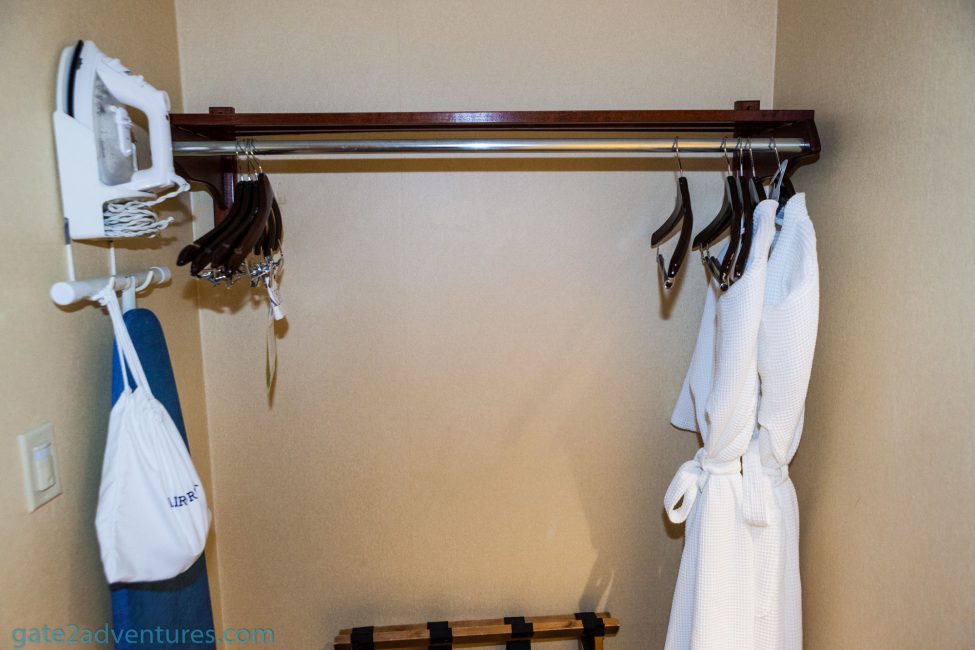 The bed is located off to the left of the room and on the other side of the room is a cabinet with the TV and refrigerator. For that size of the room and the distance between the bed and the cabinet, the TV is too small. They might want you to use the couch on the adjacent wall but the TV is facing the wrong direction. Overall the room layout is a bit weird. When you enter you have a small open area with hangers and PJ’s also good to stow one suitcase there. Next up to the left is the bathroom area. There is a counter with mirror and two sinks there. The shower and toilet are in a separate room behind you when facing the counter.