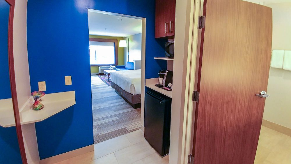 The entrance area of the room had a tiled floor. I love this setup, which helps to keep the carpets clean when you come in on a rainy or snowy day. The fridge, microwave and coffee maker are located there as well and the bathroom is entered from there as well. There is also a small corner table ideal for car keys and wallet.
