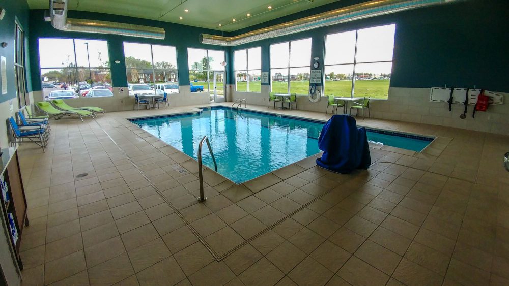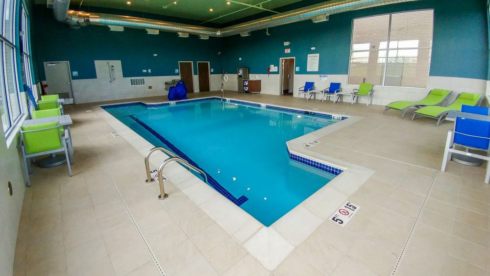 The pool is located indoors and open year-round. This is great, especially in the wintertime.