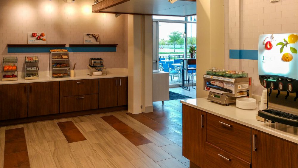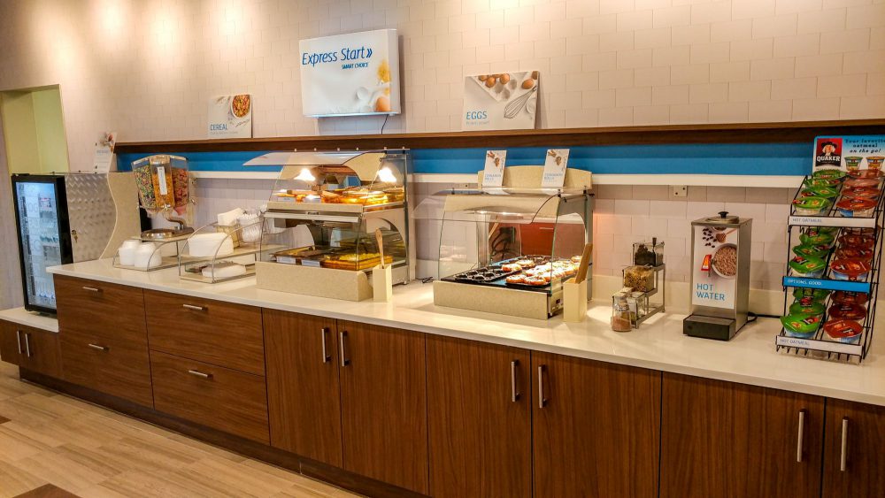 The hotel offers a complimentary continental breakfast like in all Holiday Inn Express hotels. Kids will love the pancake maker. Some days they ran out of food items like milk or toast but give them some time. The hotel is just over two months old. The staff is keeping tables clean and items stocked. The actual breakfast food area is separated in a room with hinged doors. Throughout the day the room is closed but the tables are still available for your convenience to sit down and relax.
