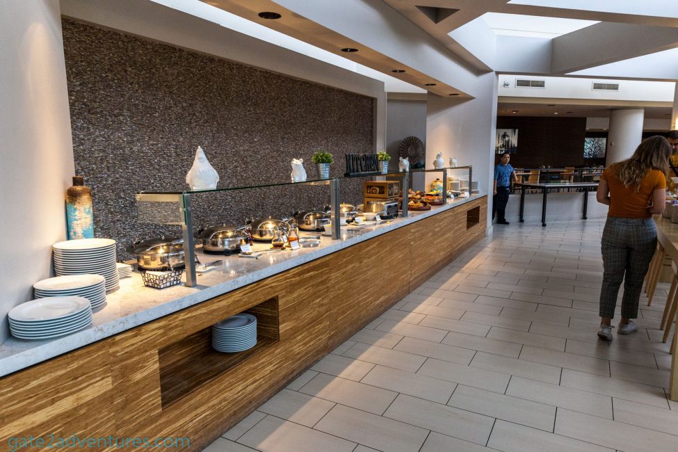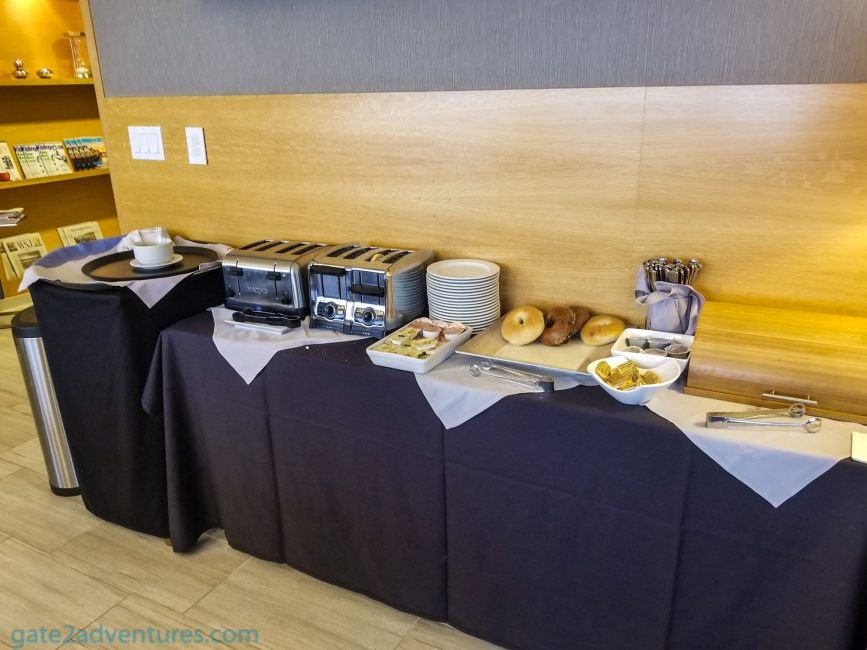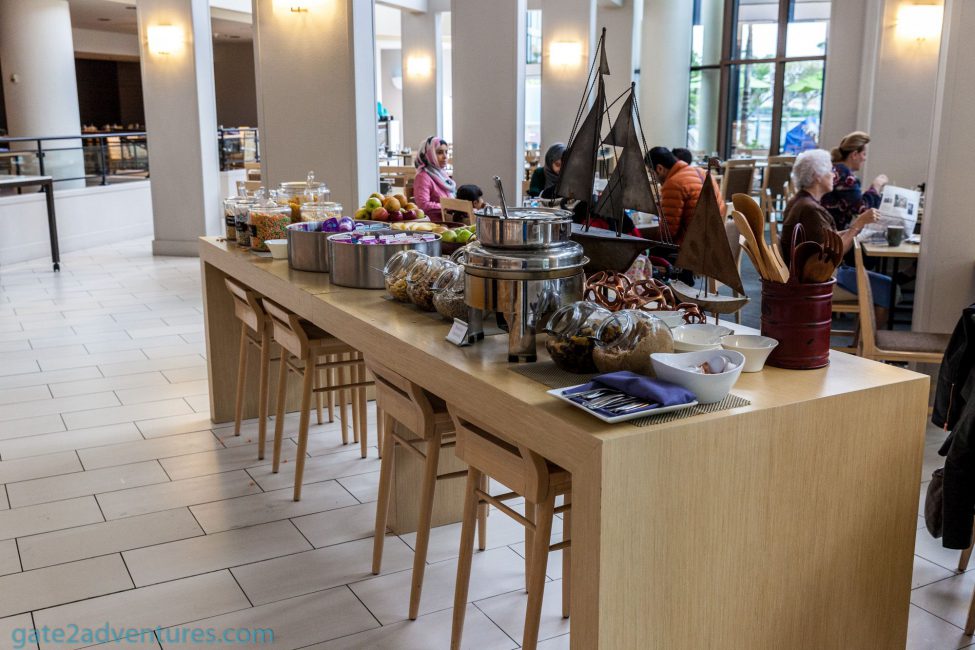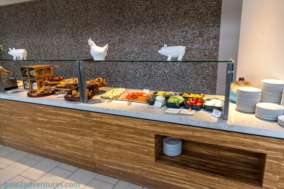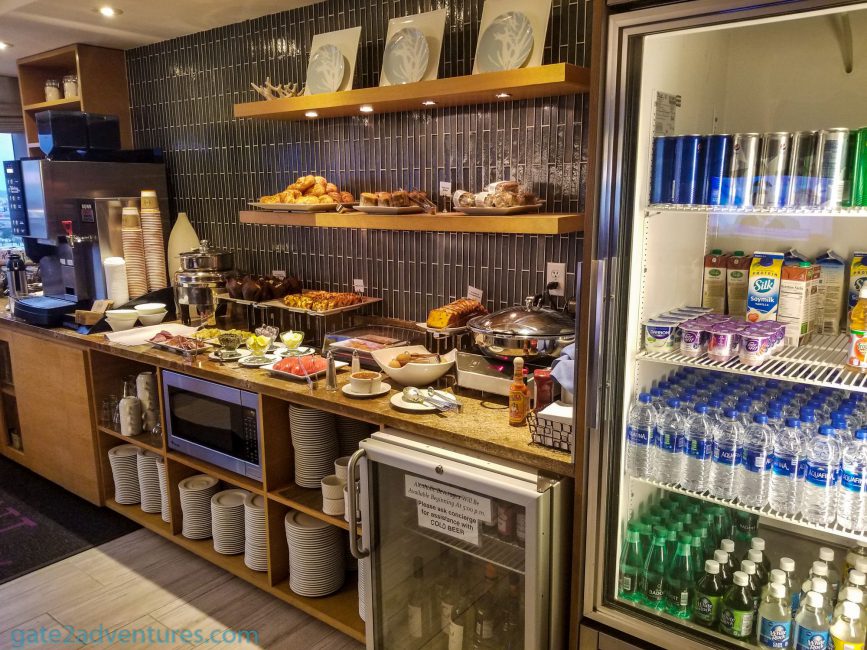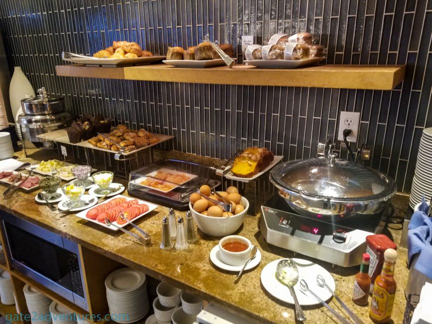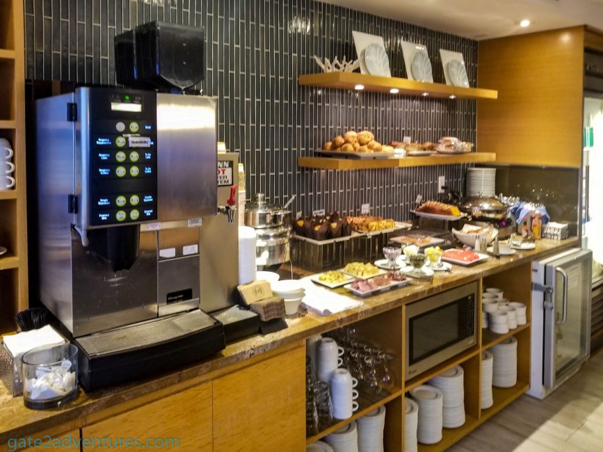 As a World of Hyatt Globalist, I had access to the Regency Club on the 16th floor. For such a big hotel this is one of the smallest club lounges I ever have seen. It really becomes a problem during breakfast hours. You better be early as otherwise, you won’t be able to sit down. The first morning I slept in and got to breakfast late. People were already outside the club eating breakfast on the high-tables.