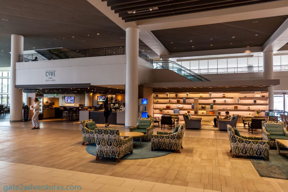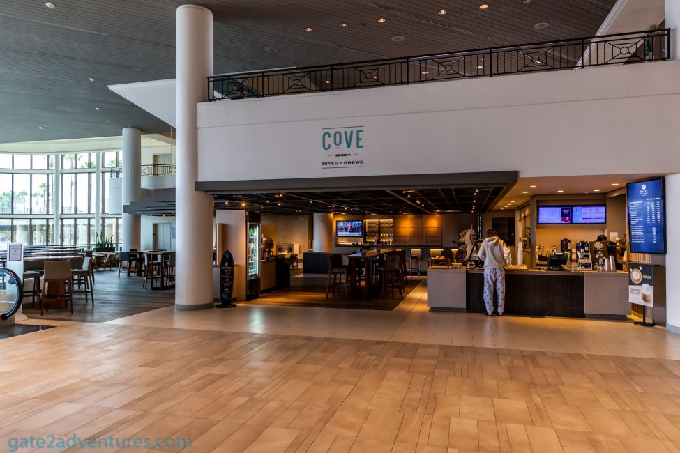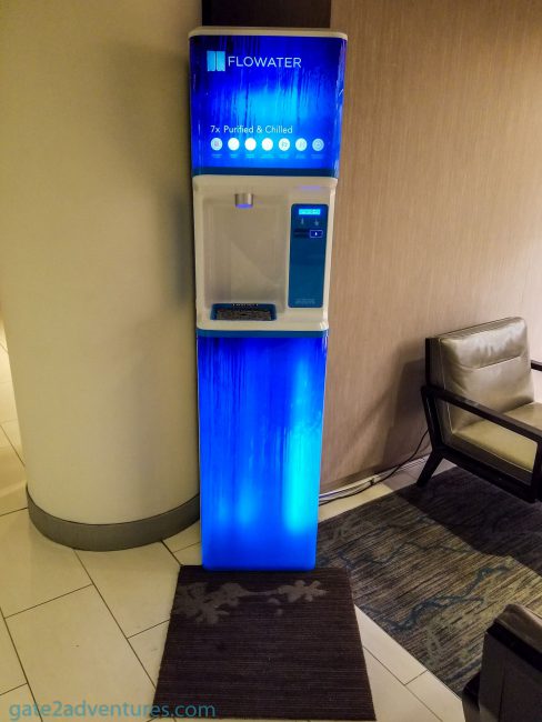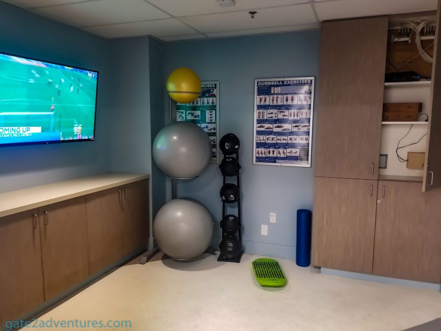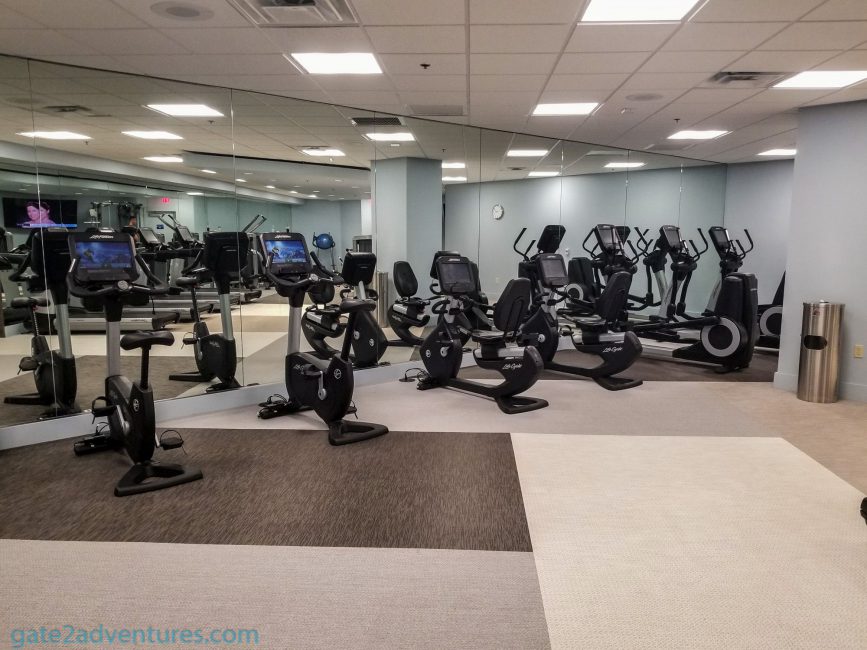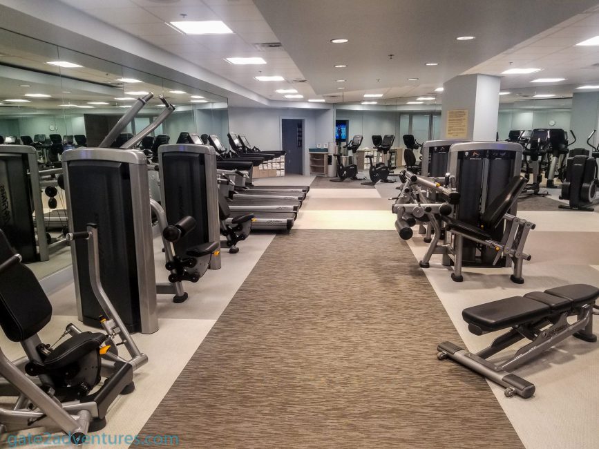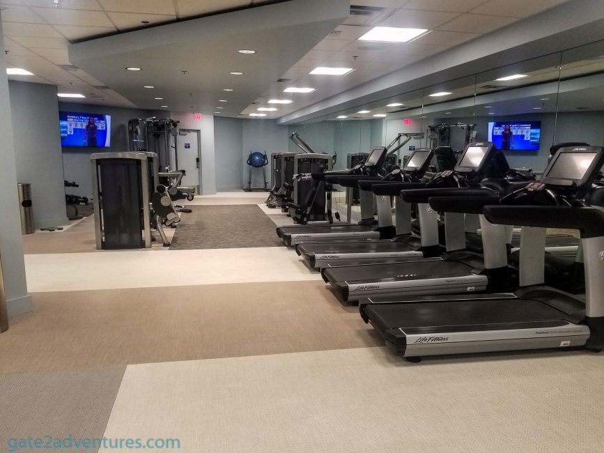 On the same level is a Starbucks coffee bar and lounge. The hallway goes down to the guest rooms and on your way there you will pass the fitness center to your left. The fitness center is spacious with lots of equipment to work out.