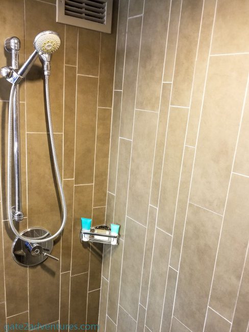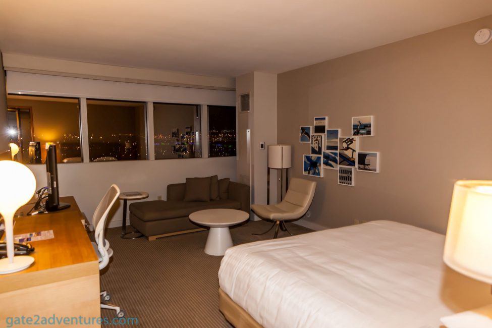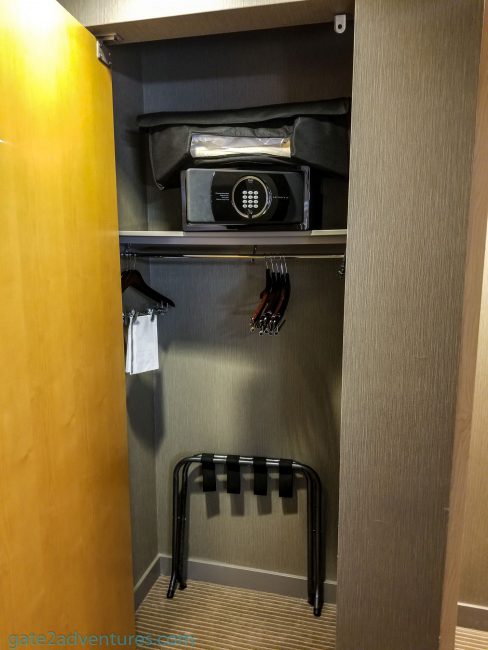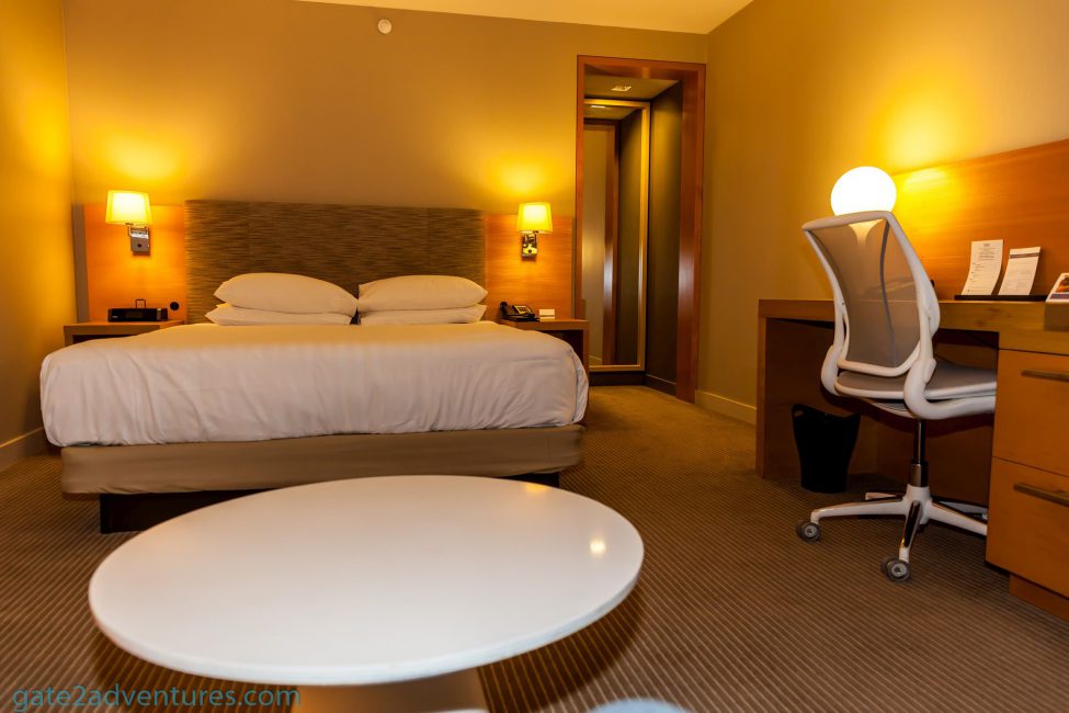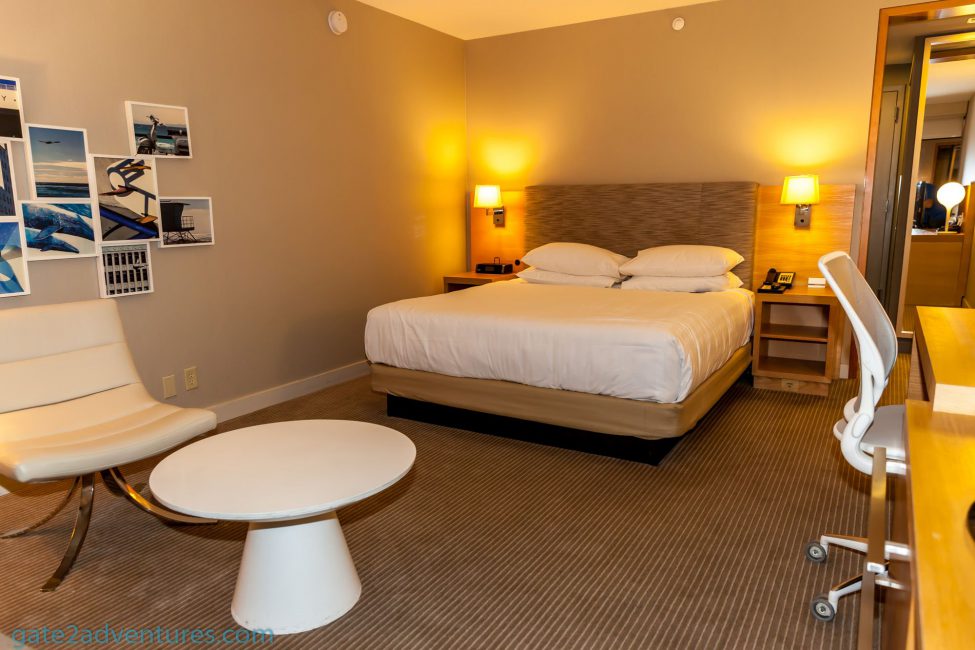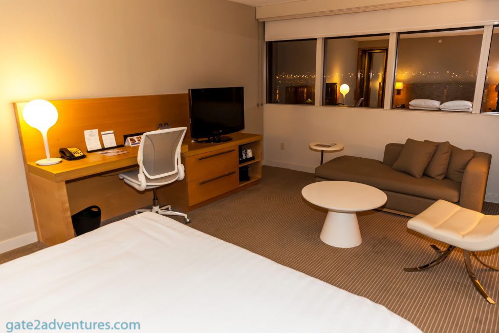 My room for the first night was on the 12th floor and had a harbor view as well. I recommend you to ask for a room with an even number as they will be facing the harbor and it’s better than the view of the city and the convention center, especially during the day. The 289 sq-ft room was feeling a bit small but still decent sized to store all your bags and with a work area/desk. To the right of the room was the bathroom and shower and on the left a closet. From there it opened up to the main room with the bed opposite the windows and facing straight towards them. on the left side was the work desk and in front, near the windows, some chairs to sit down.