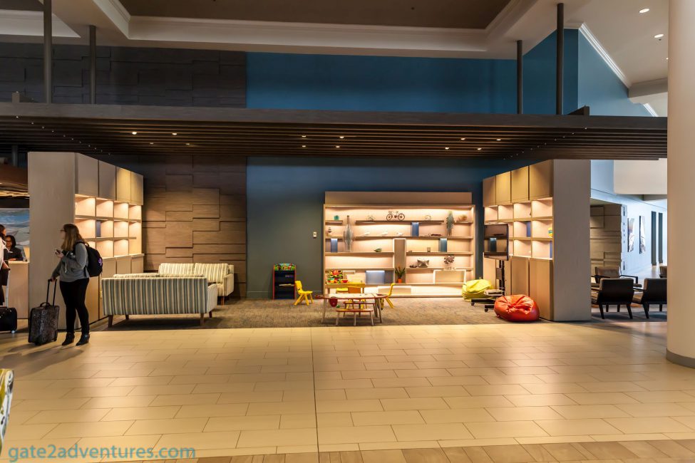 The lobby has a concierge desk with information about the local area. Close to it is a gift shop with all kinds of stuff to buy. From souvenirs to drinks, they have quite a selection. Next to the check-in counter is small kids play area with some toys a TV and Xbox. This is great to keep your kids busy. There are multiple chairs and tables grouped throughout the lobby to sit down and relax.