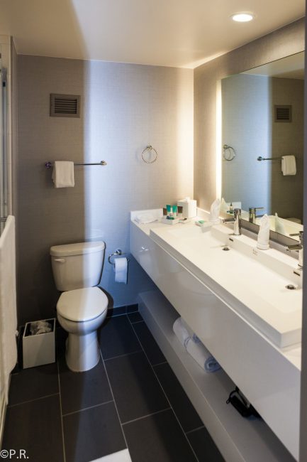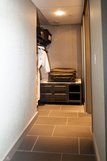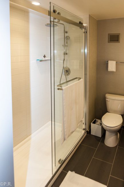The bathroom was accessible from the bedroom and space in between doubled as a closet with ways to hang your clothes and another dresser. The bathroom is huge and has a big mirror and shower area. They have a rain shower and a European-style removable shower handle. There is a sliding door with doubles as a full-size mirror between the bathroom and the closet.