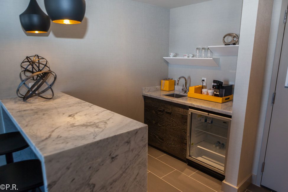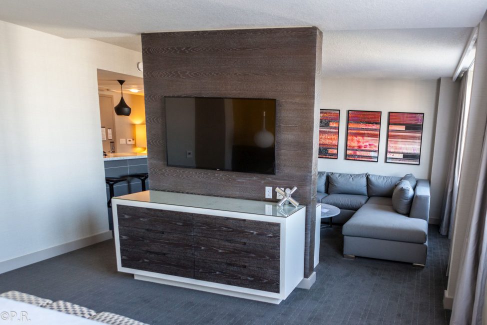 There was a divider in the room which separated the sleeping area from the living room kinda. On the living area side is a work desk and 55″ flatscreen TV on the other side another 55″ flatscreen TV and a dresser. Next to the entrance door was a small kitchen with a small sink but a huge refrigerator with glass door. Unfortunately no microwave.