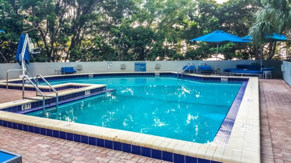 The pool and fitness center are located one level below the lobby and you have to use your keycard to access this floor. My keycard didn’t work at all and I had to get a new one and sometimes I could just press the button and it went straight to the Pool Level (P) even though the placard in the elevator says differently. The fitness center is rather small for that big property.