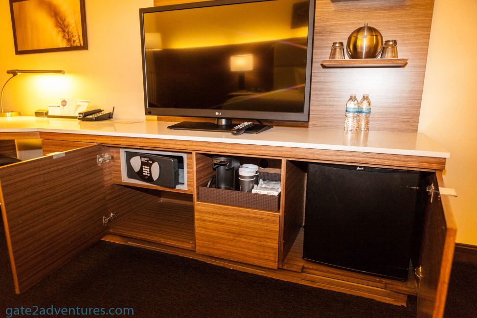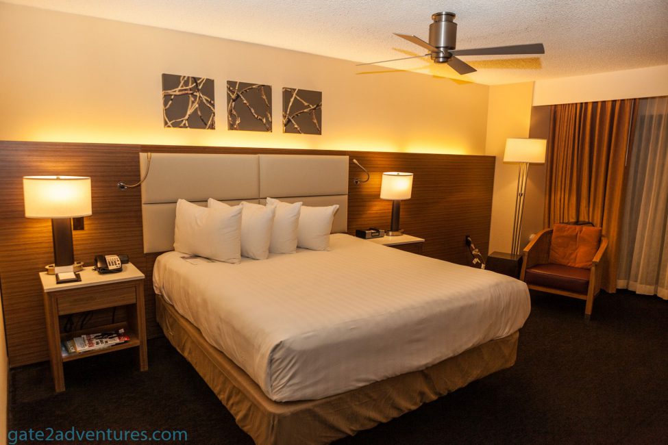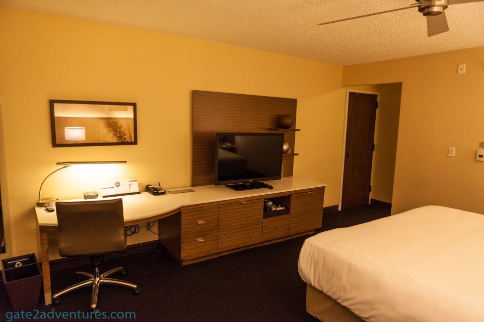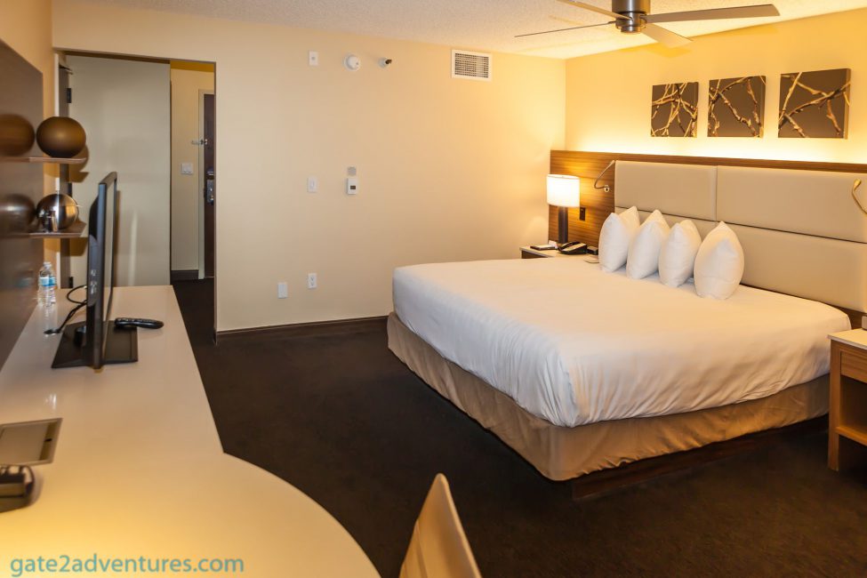 Once you walk down a bit further around a small corner you are in the actual room. The King bed is on the left side of the room with nightstands on both sides. Right across from the bed was the TV and below it was a closet desk combination going all the way along the wall. The far right end of the room has a dress-up mirror.