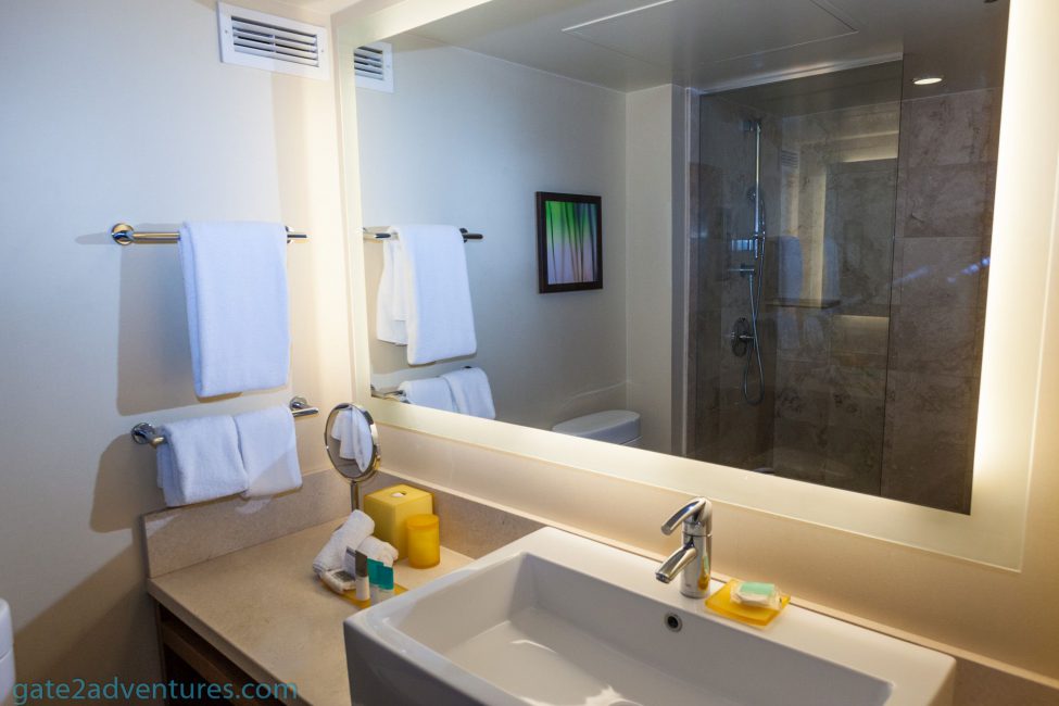 The balcony is super small and barely has enough space to fit the two chairs and a mini table. Compared to the balcony the room itself was spacious and has a lot of space. to the left, after entering the room, is the bathroom with a doorless shower. The other side of the bathroom features a big lit mirror and the sink including towel holders. The bathroom is big enough without taking too much space away from the actual room.