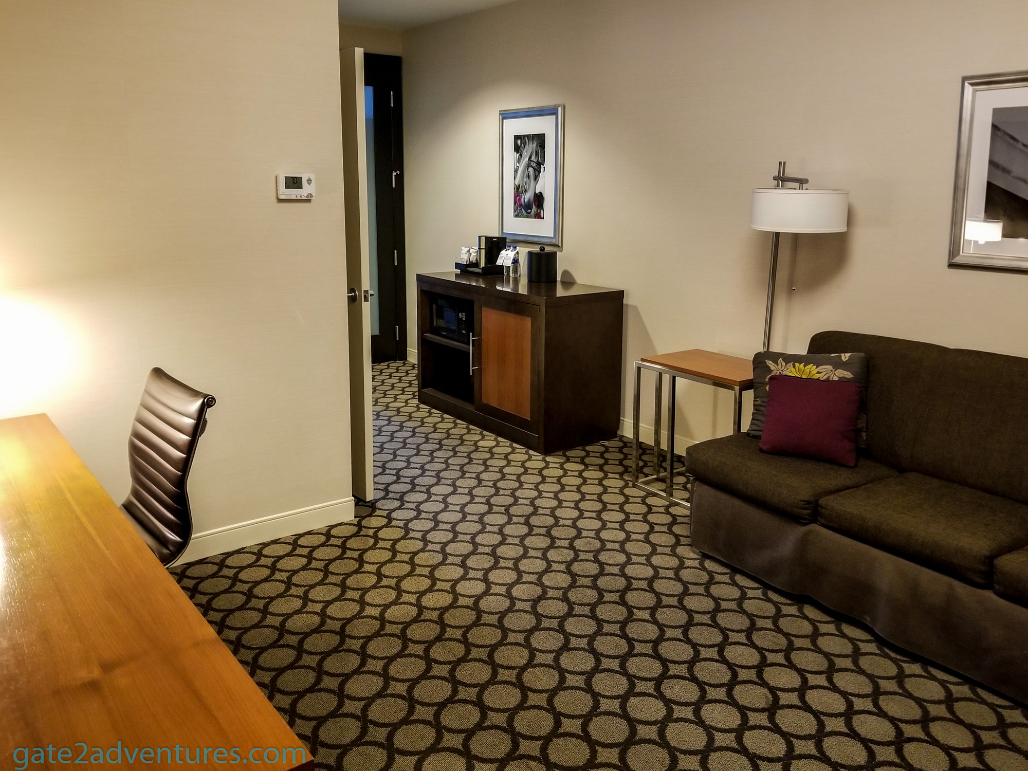 As this was my first time here at the hotel, I asked the valley for directions to the check-in counter. The check-in counters are on the other side of the outside of which I parked in front of. There are two entrance doors to the hotel lobby. One near the valet booth and one on the other end of the hotel. The check-in counter is right in between. I walked in and lined up at the “World Of Hyatt” priority lane. The agent was assisting another guest and I was second in line. After only a few seconds I got called up and was able to check-in. One of the best perks as a Globalist is the complimentary upgrades you receive and Hyatt is pretty good at upgrading loyal members. Without even asking I got upgraded right away to a 1 Bedroom King Suite.