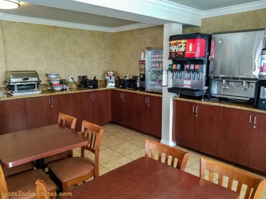 As mentioned earlier, you won’t have your breakfast anywhere near the lobby. Breakfast is served at the hospitality room on the ground floor next to the outdoor pool. To get in you need again your room key. Seating is rather limited inside the breakfast room. I would recommend you to come here early. If the SureStay hotel is full, it will get very crowded in there. They serve a continental breakfast with the usual items daily and some other items are rotating throughout the week. For example sausage links on Monday, Wednesday, Friday, and Sunday and crispy bacon on Tuesday, Thursday, and Saturday.
