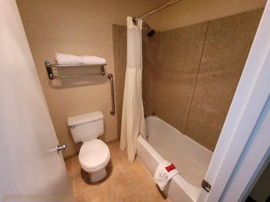 The first part of the room is identical to the other room I stayed in before. When you walk in you have the vanity and bath sink right next to the entrance door and opposite of it is the bathroom with toilet and shower/tub combination.