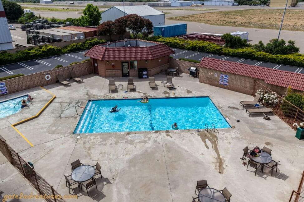 In the corner of the L-shaped SureStay hotel building is the outdoor pool. It is located behind the building from the parking lot and you need your room key as well to enter it. The pool is pretty big and made a very clean impression. Next to it is a small hot tub. Around the pools are some pool loungers.