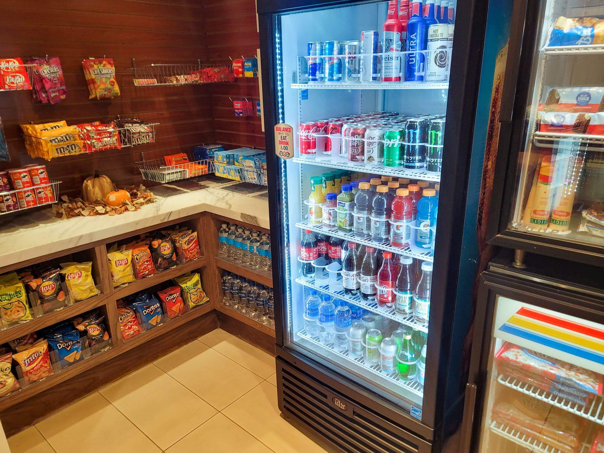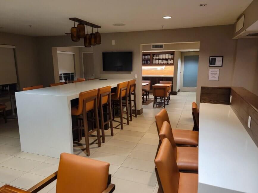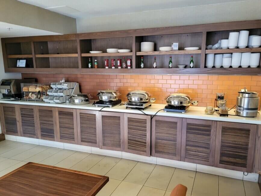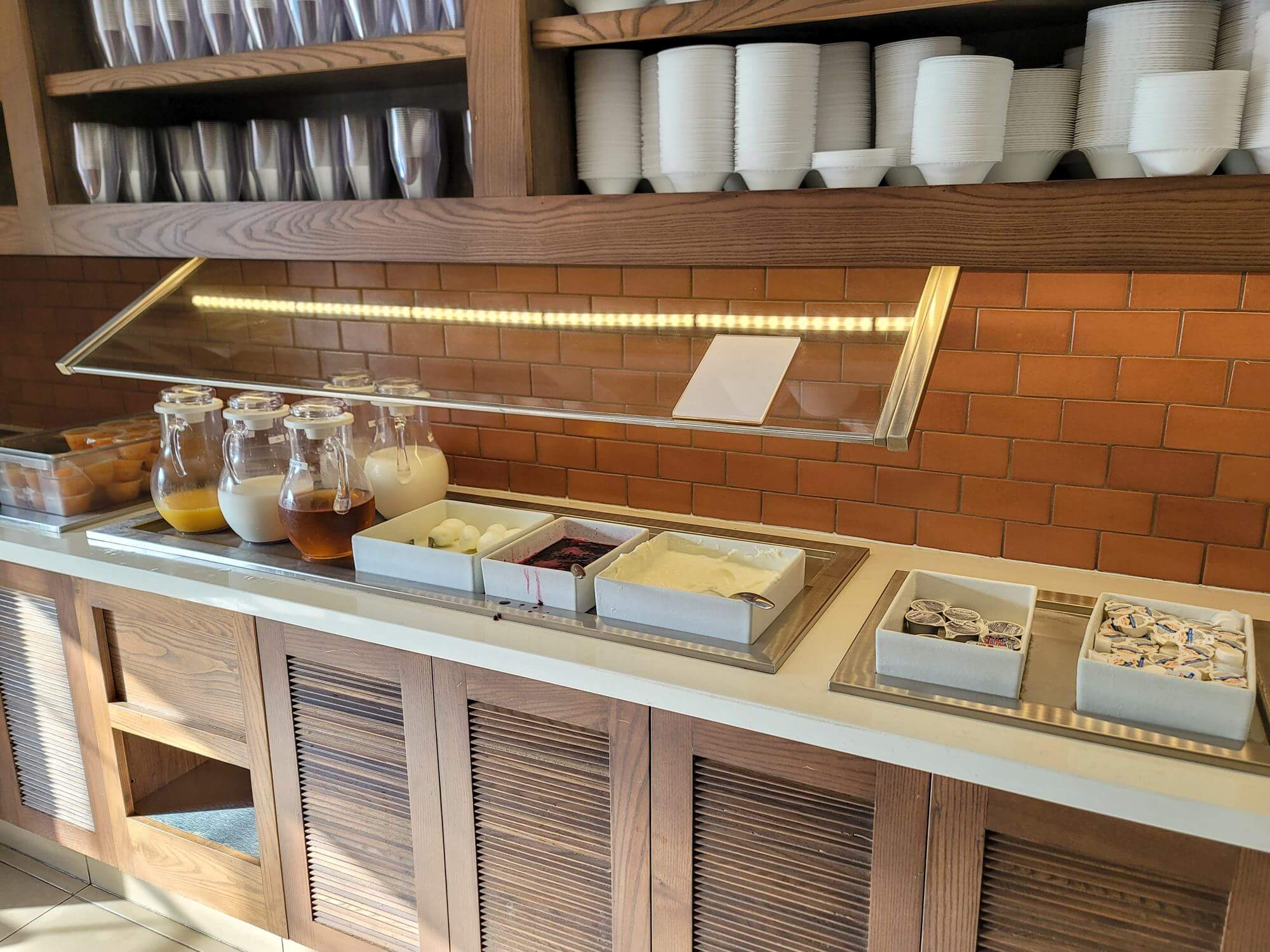 Besides that, you have an ok choice of food here for breakfast. You get eggs, bacon, breakfast potatoes, yoghurt, fruits, and cereals. Of course, there is also coffee and a variety of juices. For some reason, the breakfast team never turns on the toaster in the morning, which has a conveyor system to guide your toast through and toast it. There is quite a bit of seating in the breakfast area, but not enough for the whole hotel. Sometimes people also use this area for dinner to meet up with the rest of the group staying here.