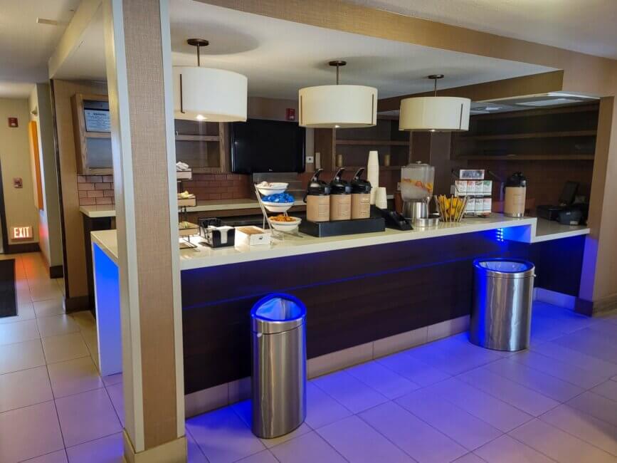 Coffee is served 24 hours a day and is set up in the area which used to be a bar. Most of the time the coffee is cold, but you can ask at the front desk to brew fresh coffee, which only takes a few minutes. It’s sad that nobody takes care of that. I have never seen this at any other hotel. You always get hot or at least warm coffee. When I get back to the hotel in the evening, it’s always cold. They just let it sit there after breakfast ends and never check it again or brew a fresh pot.