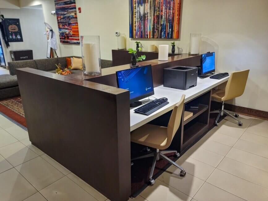 The business center is in the very back of the lobby of the main hotel building. There are two workstations and a printer available for guests to use.