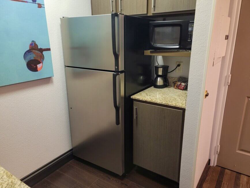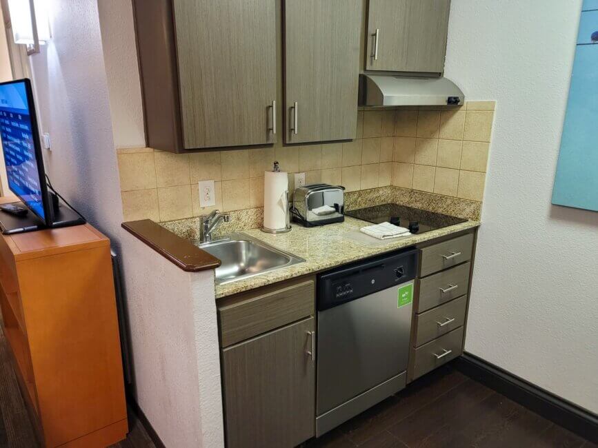 Opposite the desk is the kitchen area. You get a full-sized refrigerator, dish washer, microwave, toaster, coffee maker and stove top. The kitchen is fully stocked.