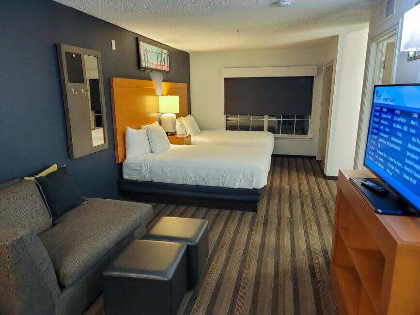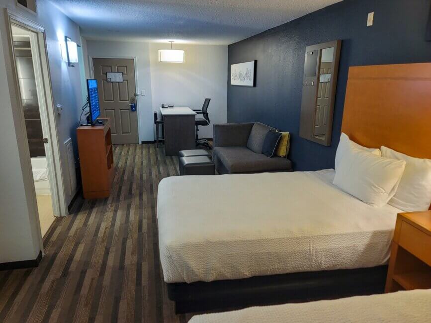 The room comes with two double beds which share a single nightstand in the center between the two. Unfortunately, the only power outlets near the bed are the outlets at the base of the lamp sitting on top of the nightstand. These are also the type of receptacles which don’t hold the plugged-in device and it tends to fall out. The beds are near the windows which offer a few outside back to the parking lot and building B of the property.