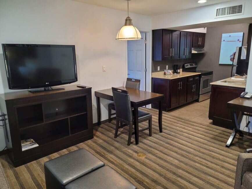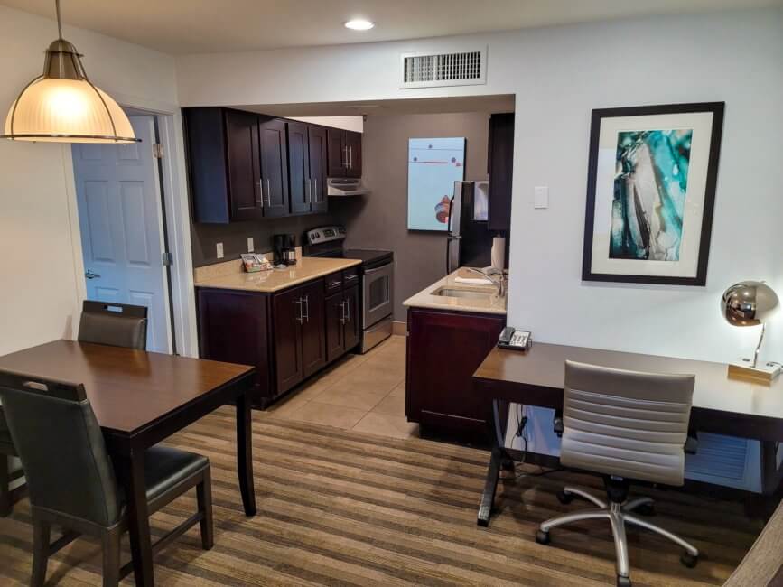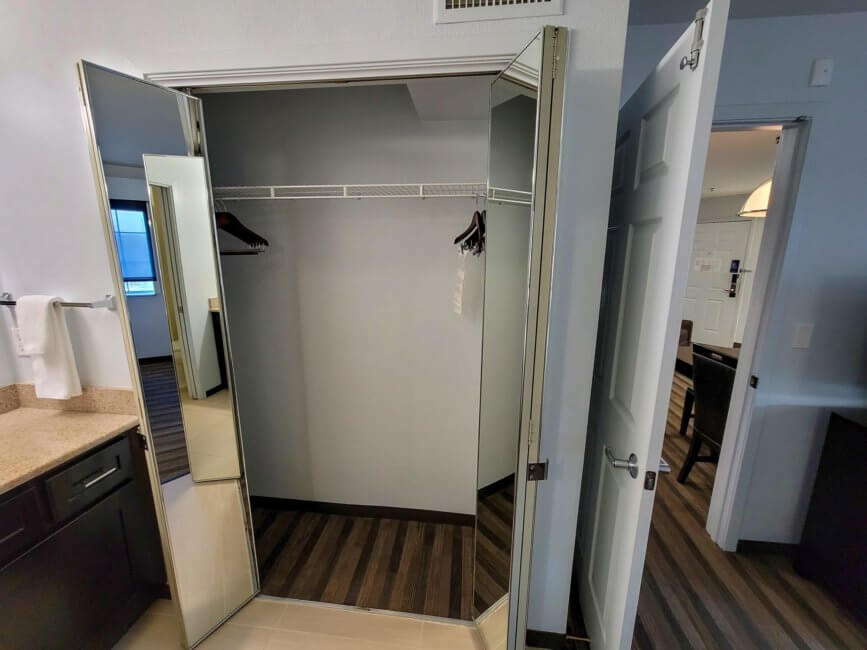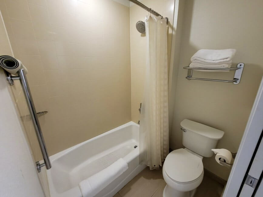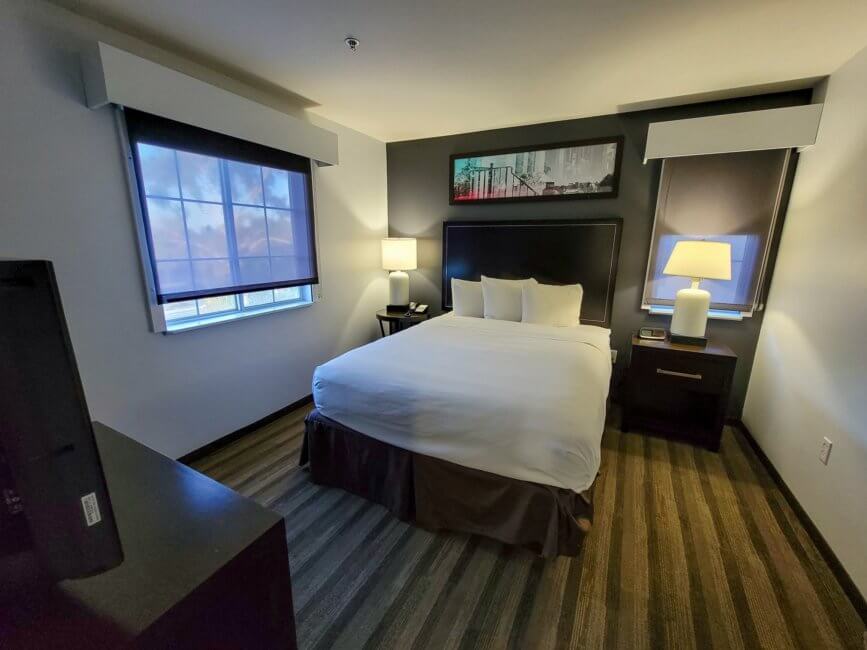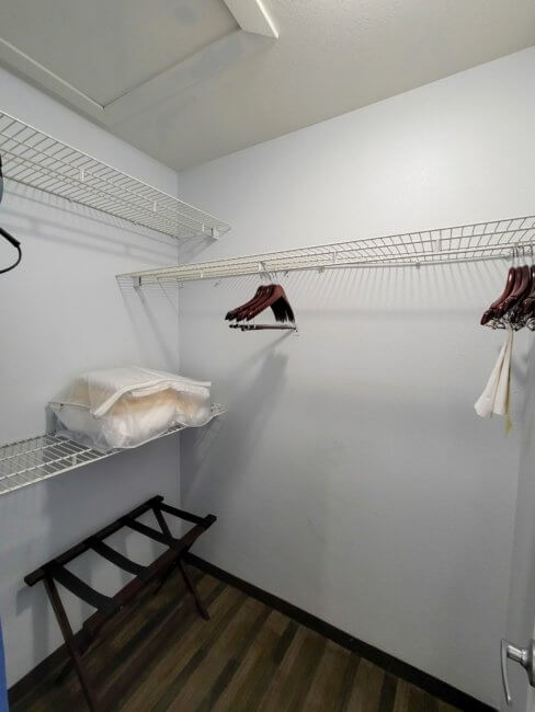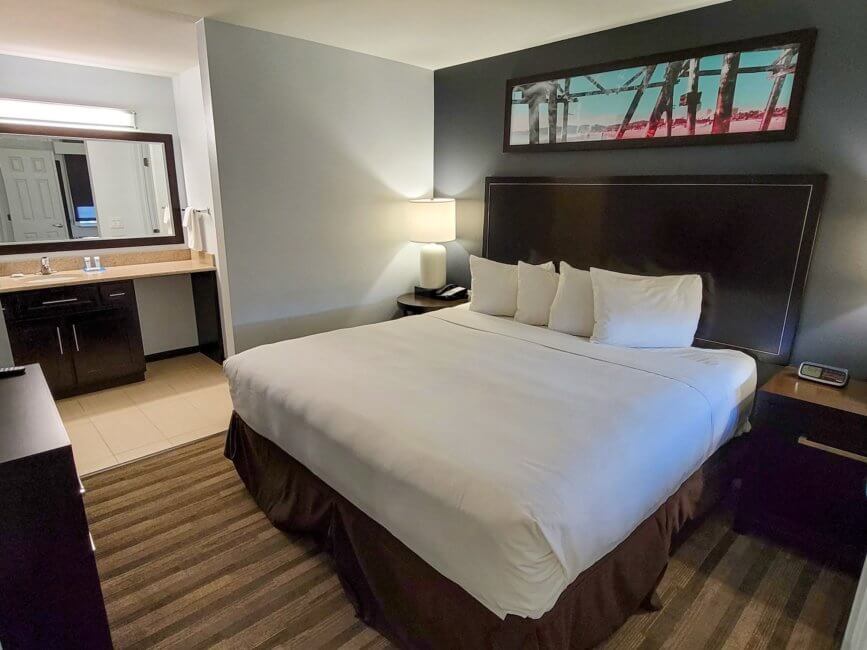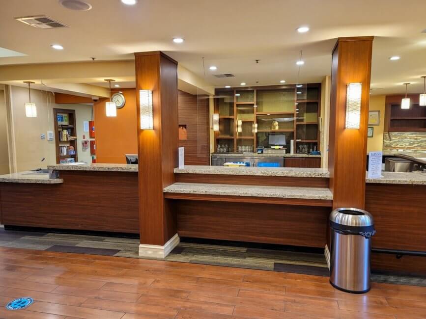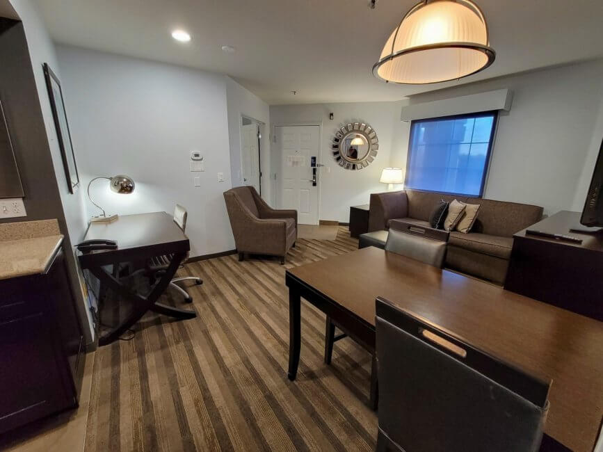 I arrived late in the afternoon and parked in front of the main entrance to check-in. There were plexiglass dividers between the agents and me to protect each other because of the pandemic. After a few minutes and signing some paperwork I got my room keys. I had booked a room with two King Bedrooms. Unfortunately, there was only a room available with one King Bedroom and the second room would be a Queen bed. My booked room was not available during the first night, but I got offered to check back in the morning and move. I didn’t really care, as it would be just me anyway but I knew I would be stuck here for a while and liked the extra space. The prices for both room types were the same, so that wasn’t an issue either. As it was a long day of driving from Salt Lake City to the Bay Area, I just took the room to get settled and relax. The agent also let me know that there are no elevators at this property. That was a bit of a shock and very uncommon for hotels. It would be quite a bit of schlepping to get all my stuff up to the third floor. I don’t travel light, my suitcases weigh 70 lbs each. But I knew that this would be an extended stay for a few months and therefore didn’t mind the extra workout. Be aware, if you have issues carrying your bags up a set of stairs, you might want to consider getting a room on the ground floor.