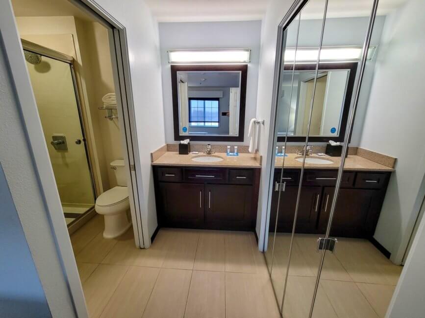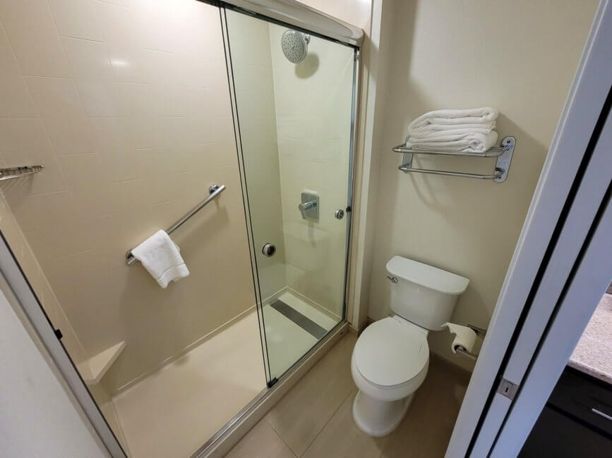 The actual bathroom is separated by a door and only features a walk-in shower instead of a bathtub and shower combination.