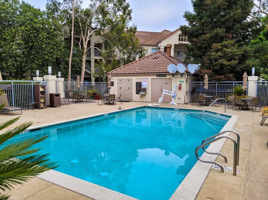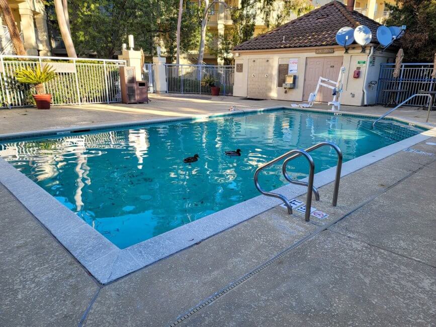 Inside the courtyard, you can find the outdoor swimming pool. It was closed the whole time I was staying there. Besides some ducks, nobody was allowed to use the pool. Next to the pool is a BBQ area with gas-powered grills. This would be a nice spot to hang out and enjoy, but the pandemic was in full swing and the area was closed for mingling due to local health orders. Once the BBQ pit is open again, you can borrow all the required utensils from the front desk.