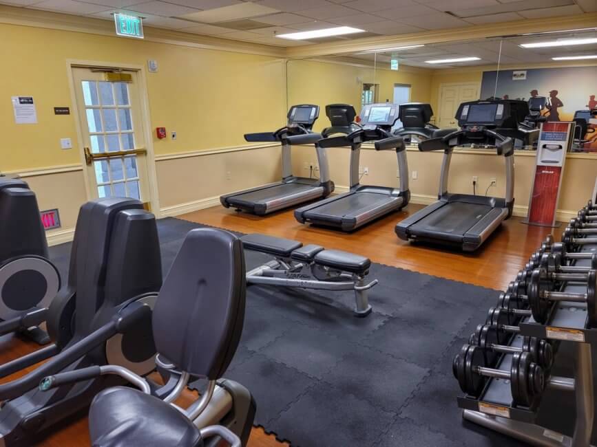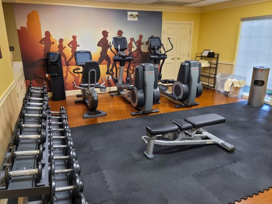 To the left of the front desk is the marketplace as well as a small business center. It features two workstations and one shared printer. The main building, which houses the lobby, also houses the 24-hour fitness center. Inside you find a good selection of workout equipment.