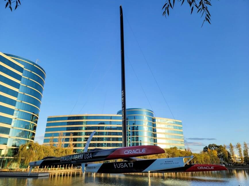 Access to the Bay Trail, which leads along the whole bay, is just a short walk away. You can take a stroll along the bay and if you head south turn off to stroll through the Oracle campus and go down to their artificial lake. Inside the lake, you can see USA-17, a racing trimaran of the American sailing team “BMW Oracle Racing” which won the America’s Cup in 2010.