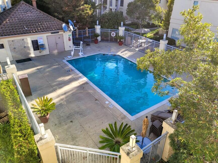 The Hyatt House Belmont/Redwood Shores is located in the City of Belmont just to the east of Highway 101, one of the main routes on the San Francisco peninsula. This makes it easy to get wherever you need to go. The hotel is located in a residential neighborhood and it is basically a dead end as the road here are facing the San Francisco Bay and you can only drive around the neighborhood before the roads end here. Right next door is the gigantic campus of the tech giant Oracle. As all the tech companies in the area transmitted to a work from home policy, there was no traffic from workers, who would normally work on-site. Next to the hotel property is a small lake with a gazebo. It’s such a quiet neighborhood, you see ducks not only swimming in the lake but also walking the streets and sidewalks.