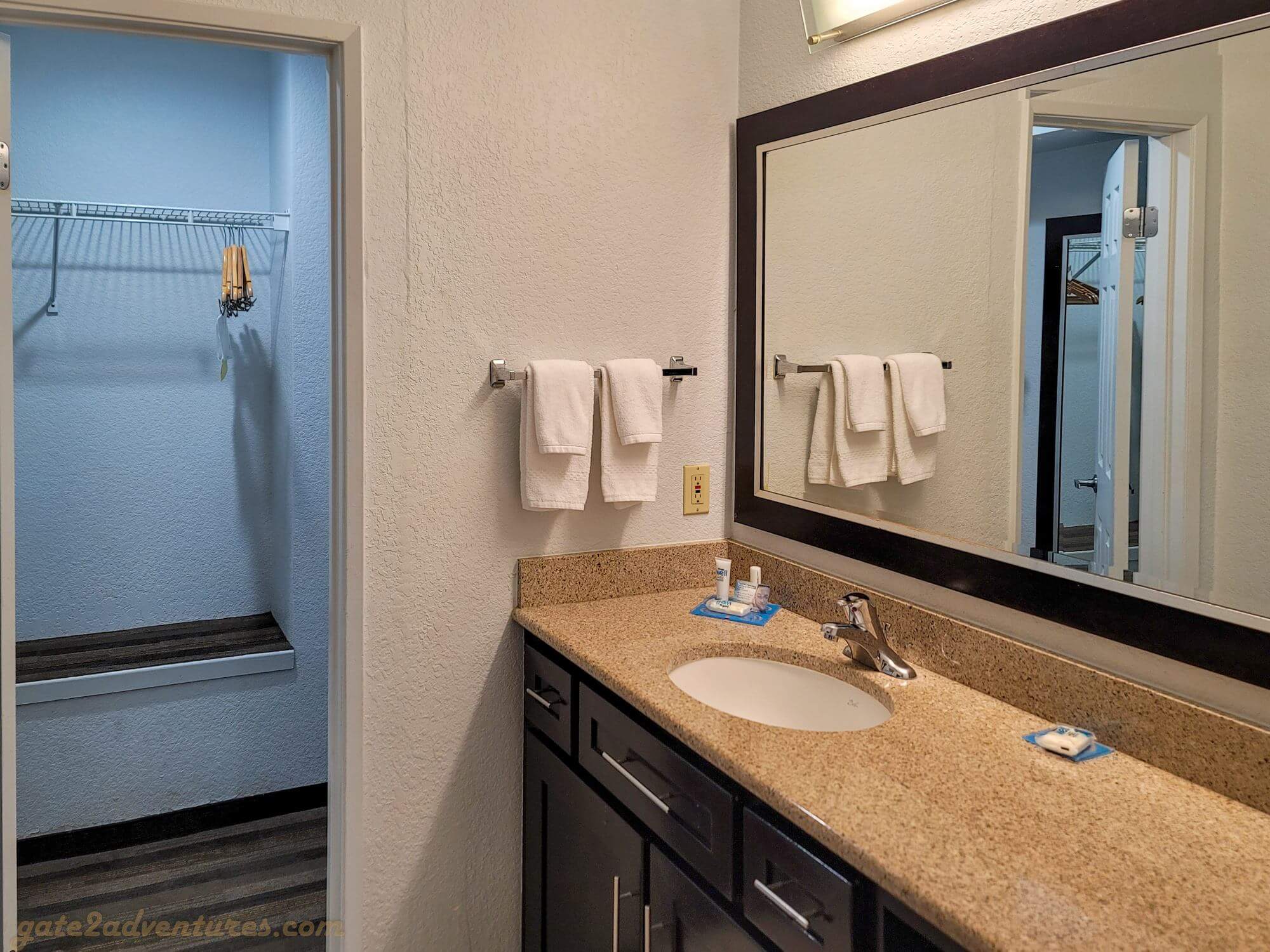 Normally they would charge $14/night to park here. Thanks to my Globalist status they waived it and gave me the parking placard I had to put on my windshield. My status also gives me a free bottle of water per day. To get the bottle you need to show the card they put in your room key envelope. The agent working the front desk gave me a quick overview of the hotel, where my room is and where I can park best. I don’t know if it was a coincidence or if they assigned me this room because I told them I have many heavy bags. The assigned room was in Building 12 and facing the parking lot. This made it super easy to unload my stuff. But I would have been happy with every other ground-level room as well, even if facing the hotel’s courtyard. Last but not least, I received a little welcome bag from the sales team before I headed out to park in front of my room and unload.