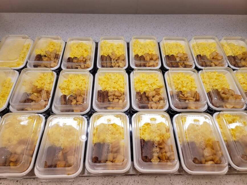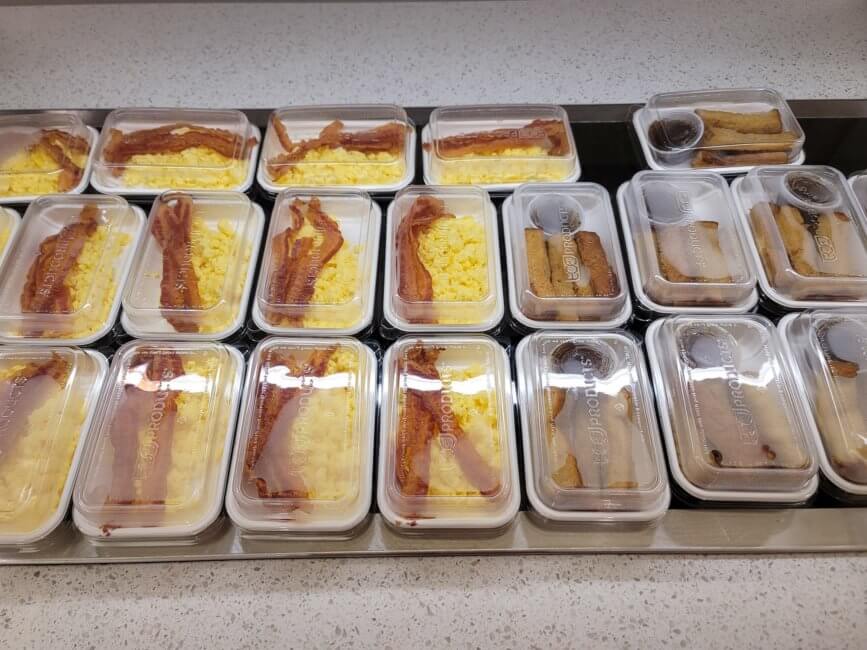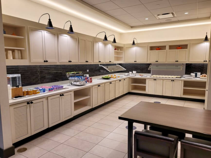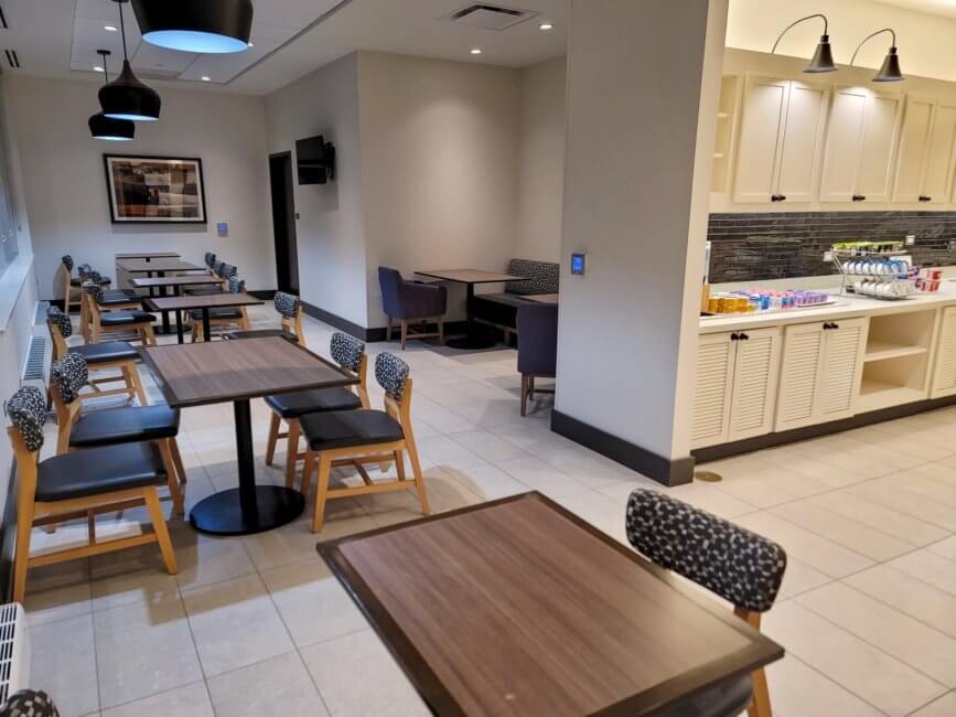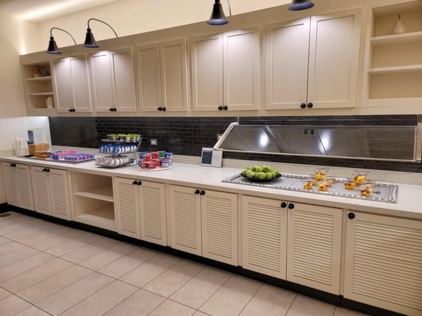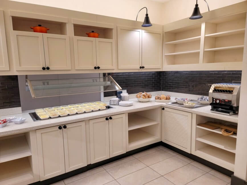 Breakfast is complimentary. Because of the ongoing Coronavirus Pandemic, everything at the buffet is packaged separately. There are covered plates with eggs potatoes and sausage or just eggs and potatoes. Everything else is packaged individually as well like bagels and your utensils. Cereals, yogurts and juices come in small packages as well. The breakfast room is open and you can sit there to eat or grab a to-go bag and take it with you. Coffee and Tea are served at the counter of the bar. Unfortunately, they only offer half&half creamer and no flavored creamer.