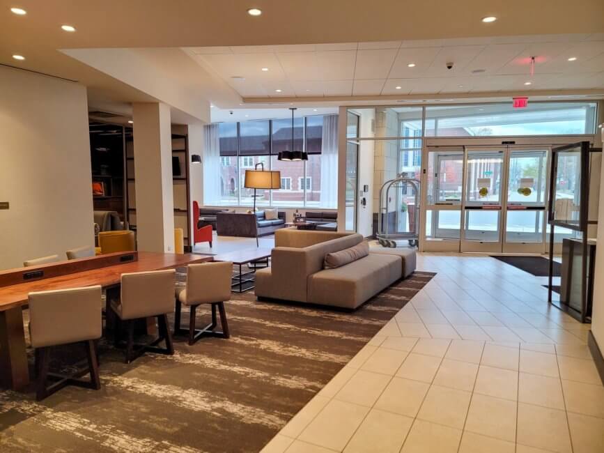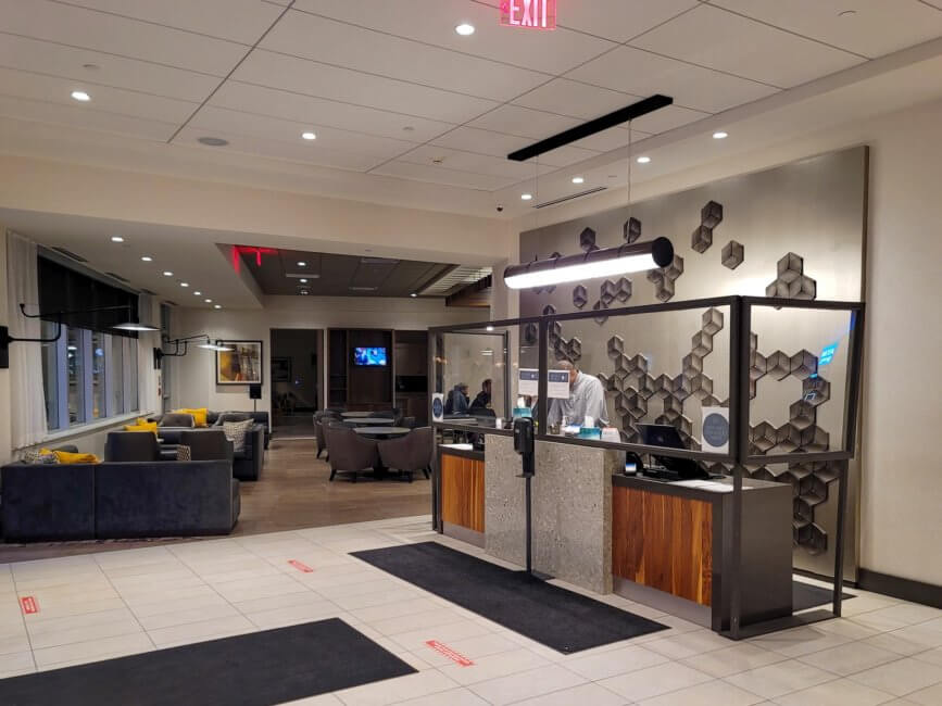 I wasn’t exactly sure in what kind of neighborhood the Hyatt Place Detroit / Royal Oak would be located. I booked the Hyatt Place Detroit / Royal Oak because it was very close to my project site. I flew into DTW and rented a car. Once I got closer, even though it was already late at night, I realized that the hotel is in downtown Royal Oak. I wasn’t sure where exactly to park but once I got close to the hotel building, I saw the sign on the curb that you can park right at the curb to check-in. I went inside and noticed the sign that fully vaccinated guests don’t need to wear facemasks on this property. This courtesy also gets extended to the employees. Keep that in mind. There are dividers at the check-in counter for added safety.
