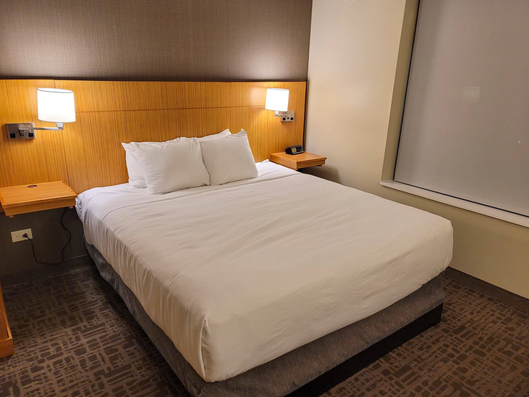 The King Bed rests against the wall towards the bathroom and faces parallel to Main Street. It has a large headboard taking up the whole wall. On either side of the bed is a nightstand that is mounted onto the headboard. There is also a lamp on either side of the bed, also mounted to the headboard. The lamp base has power outlets.
