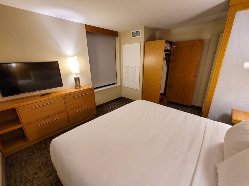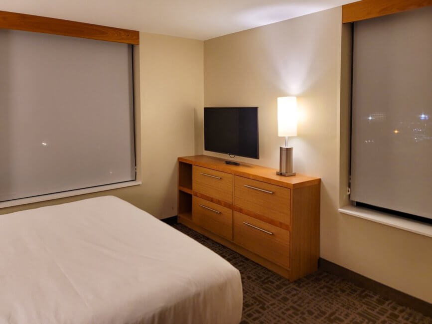 Opposite the bed is another dresser with multiple drawers for your belongings. This one is located between the two windows of the room. On top of the dresser sits a lamp and a wall-mounted TV is located above the dresser. One of the nights, I tried to use the Chromecast feature but wasn’t able to stream to the TV. After some troubleshooting myself, I found that for some reason the Chromecast device was unplugged from the TV. After plugging it in, it was as easy as always to stream from my phone to the TV.