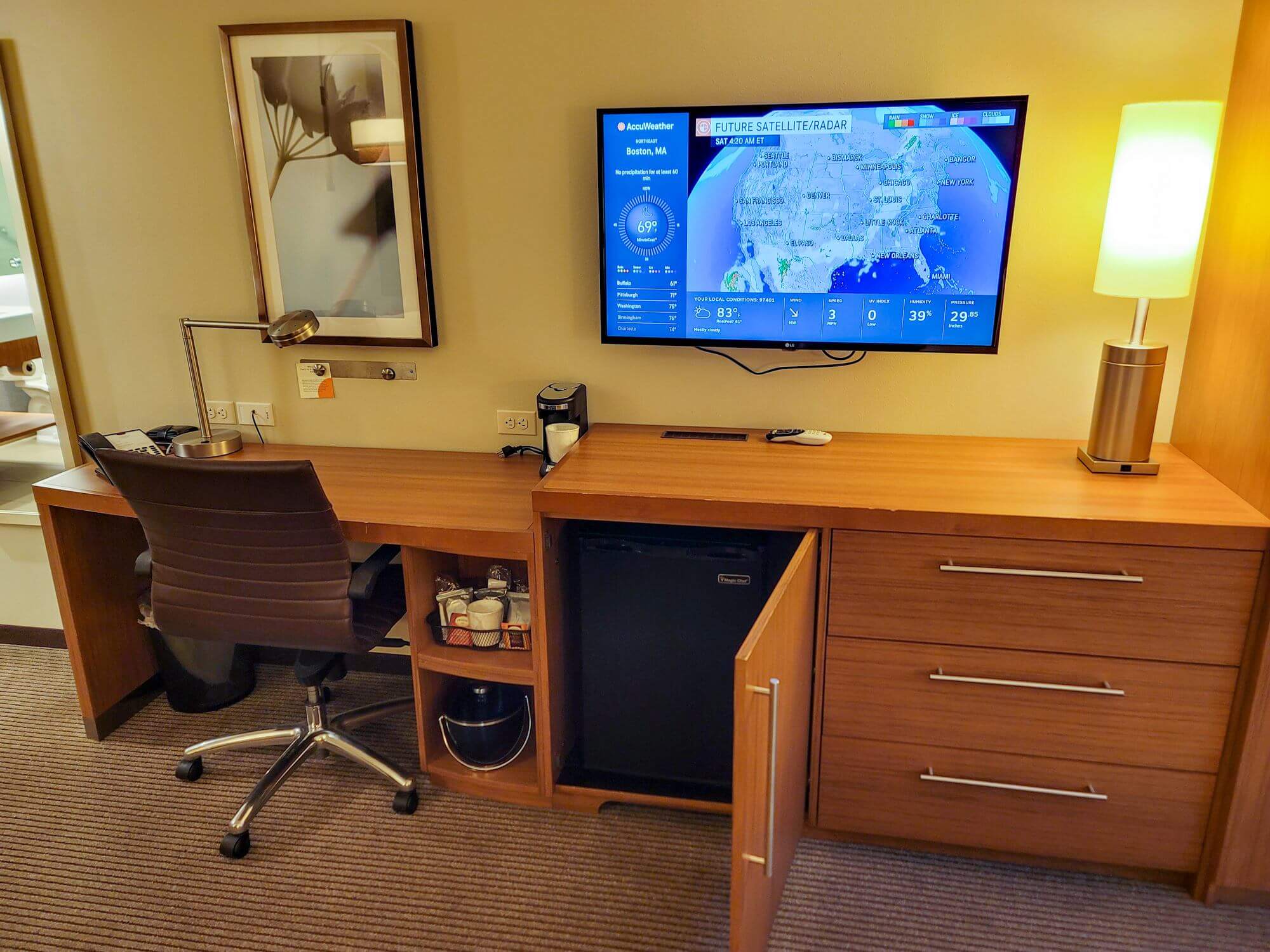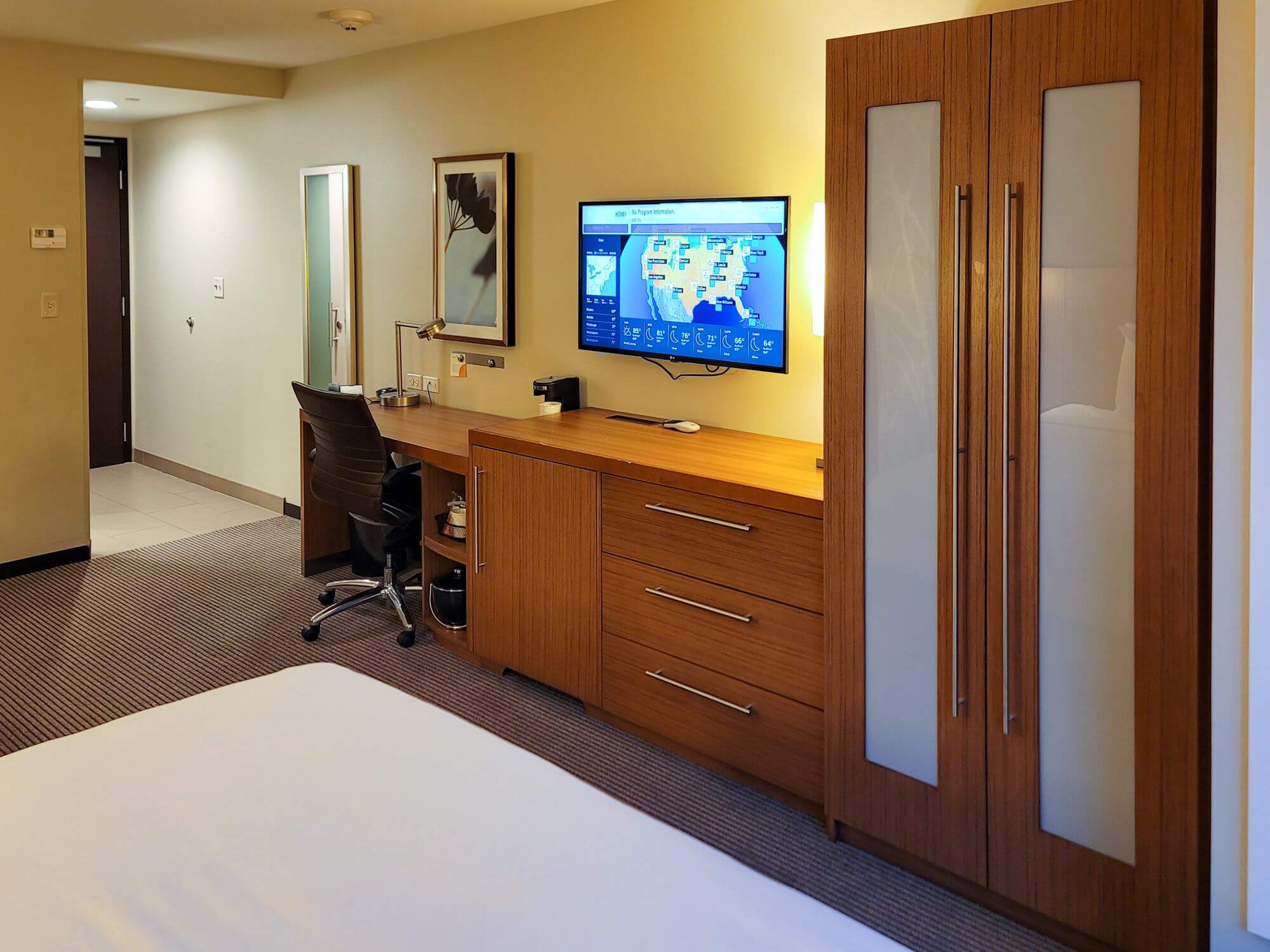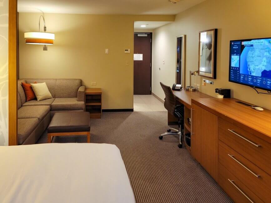 After the entryway you have a small living area which consists of an L-shaped sofa which can be transformed into a bed if needed. In front of the sofa is a small ottoman chair. On the other side of the room from the sofa is a work desk with an office chair. On top of it you will find the in-room hotel phone as well as the coffee maker. The shelves on the right side of the desk hold the condiments for the coffee maker and ice bucket. Attached to the office desk is a dresser with three drawers. Behind the door of the dresser hides a well-sized refrigerator. Above the dresser is a wall-mounted TV which can be swiveled slightly to either side. This hotel features Chromecast integration, which lets you stream content from your phone directly to the TV.