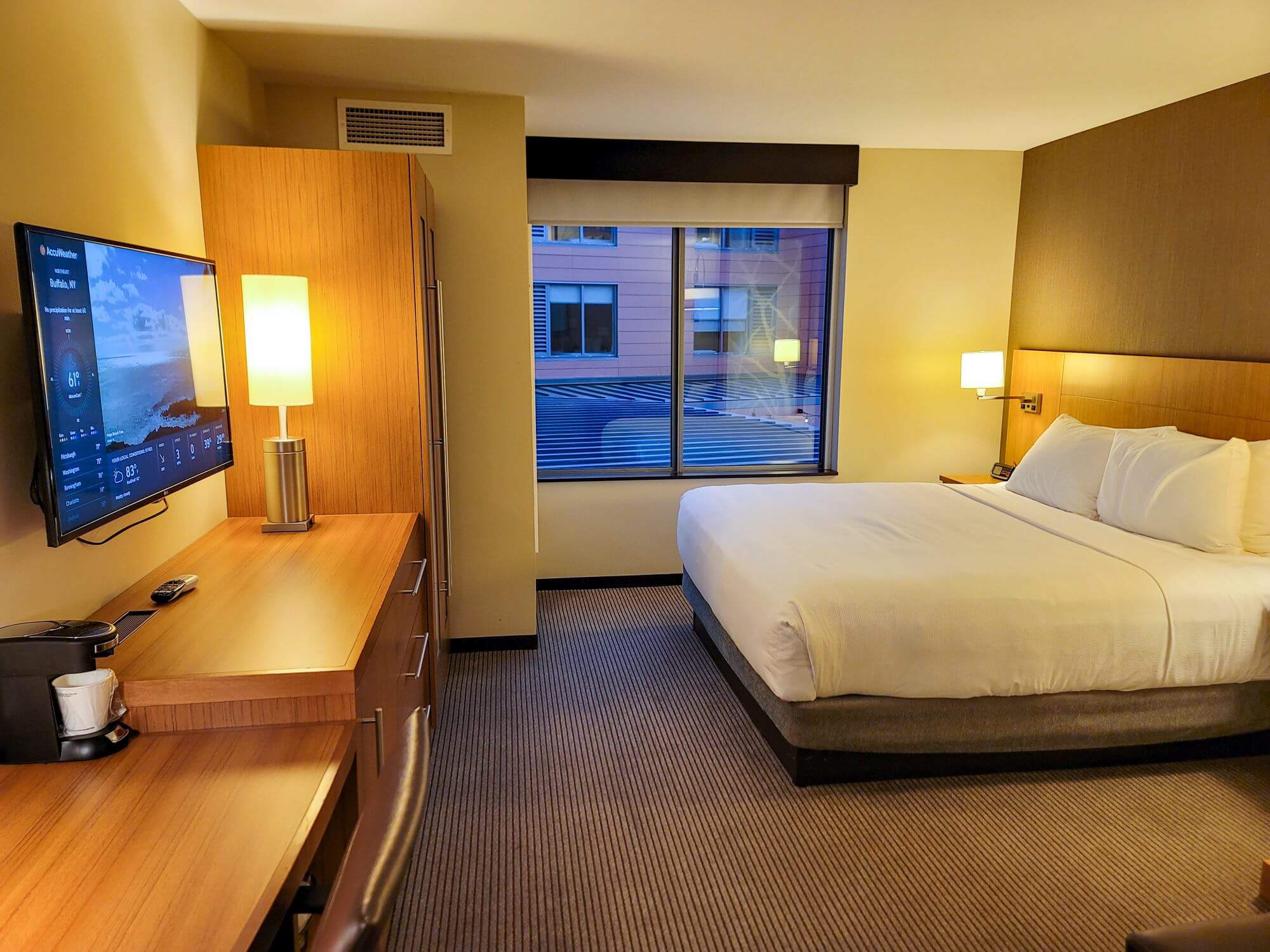 Next to the dresser is a closet for additional storage space. The closet is next to the air conditioning unit which sits in the corner of the room. Opposite the closet is the King bed. On either side of the bed is a nightstand which is mounted to the headboard. The window in this room does not have a particularly pleasant view. Straight ahead is the second half of the U-shaped layout of the hotel section of the building. You see the room of the lobby area as well as a partial view of the outdoor patio.