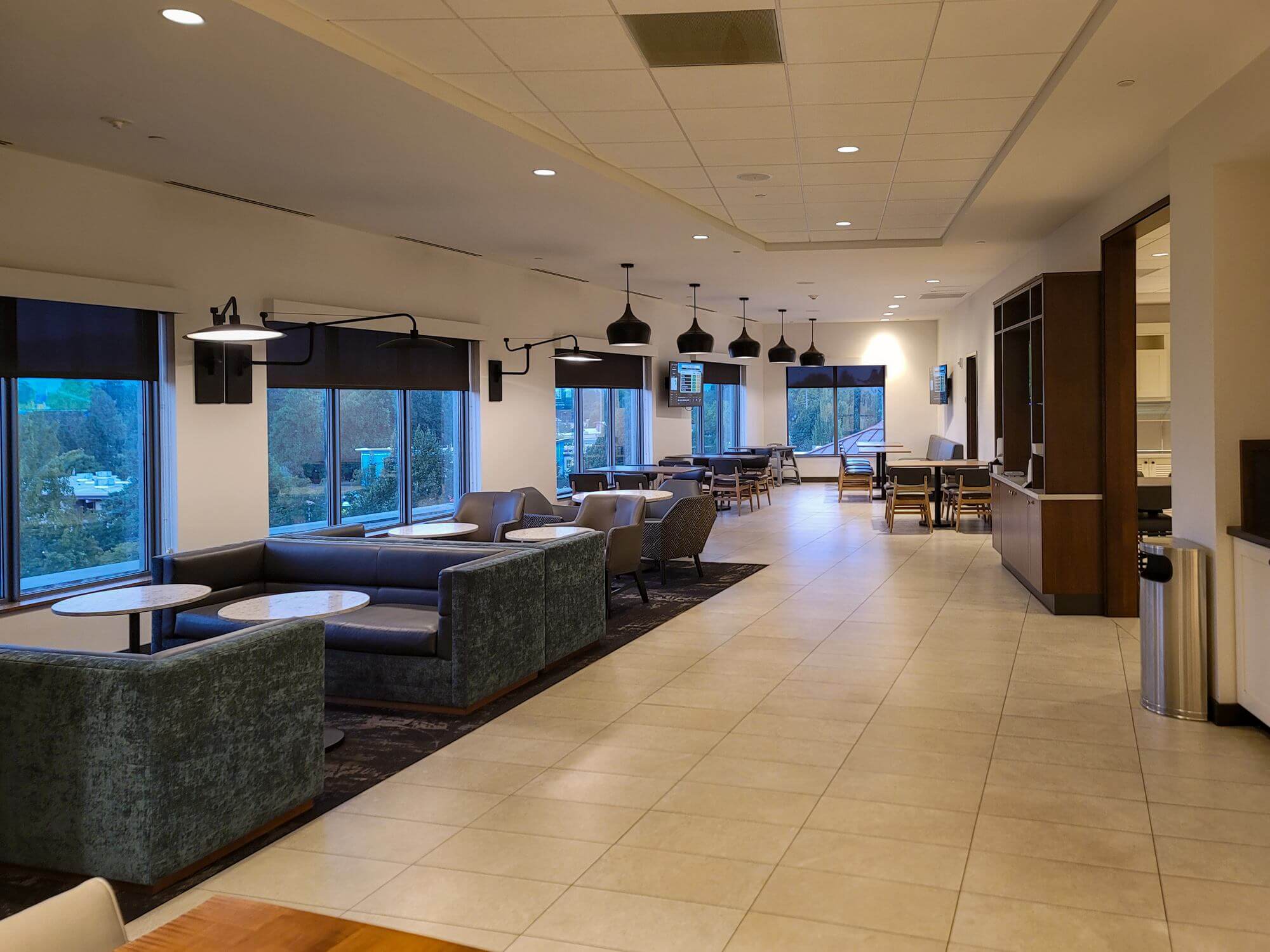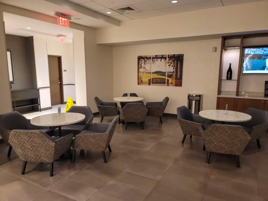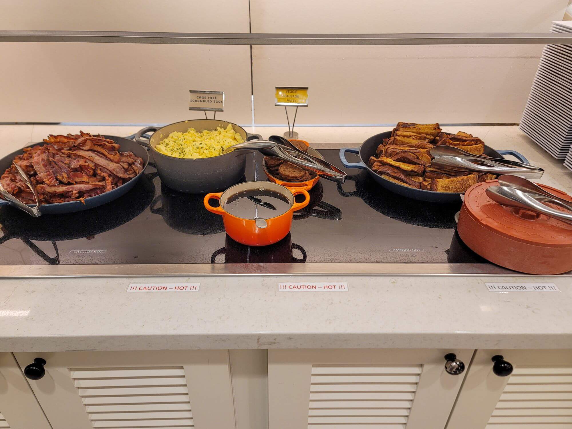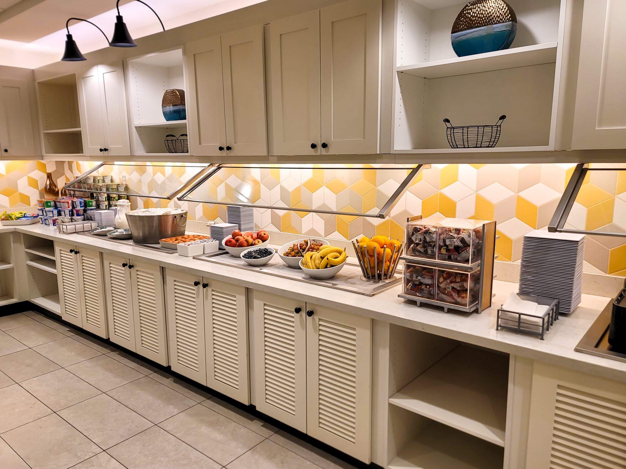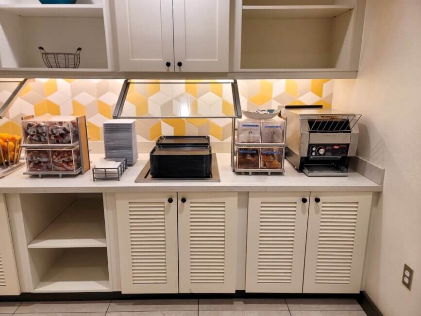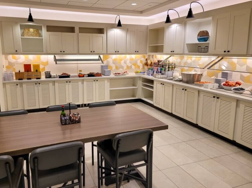 The breakfast area is located to the right of the front desk on the fifth floor. It’s a very spacious area and features lots of seating options. The first half is more comfortable sofa chairs and small tables which you would use to hang out during the evening hour rather than for breakfast. The second half features actual dining tables which are perfect for breakfast.
