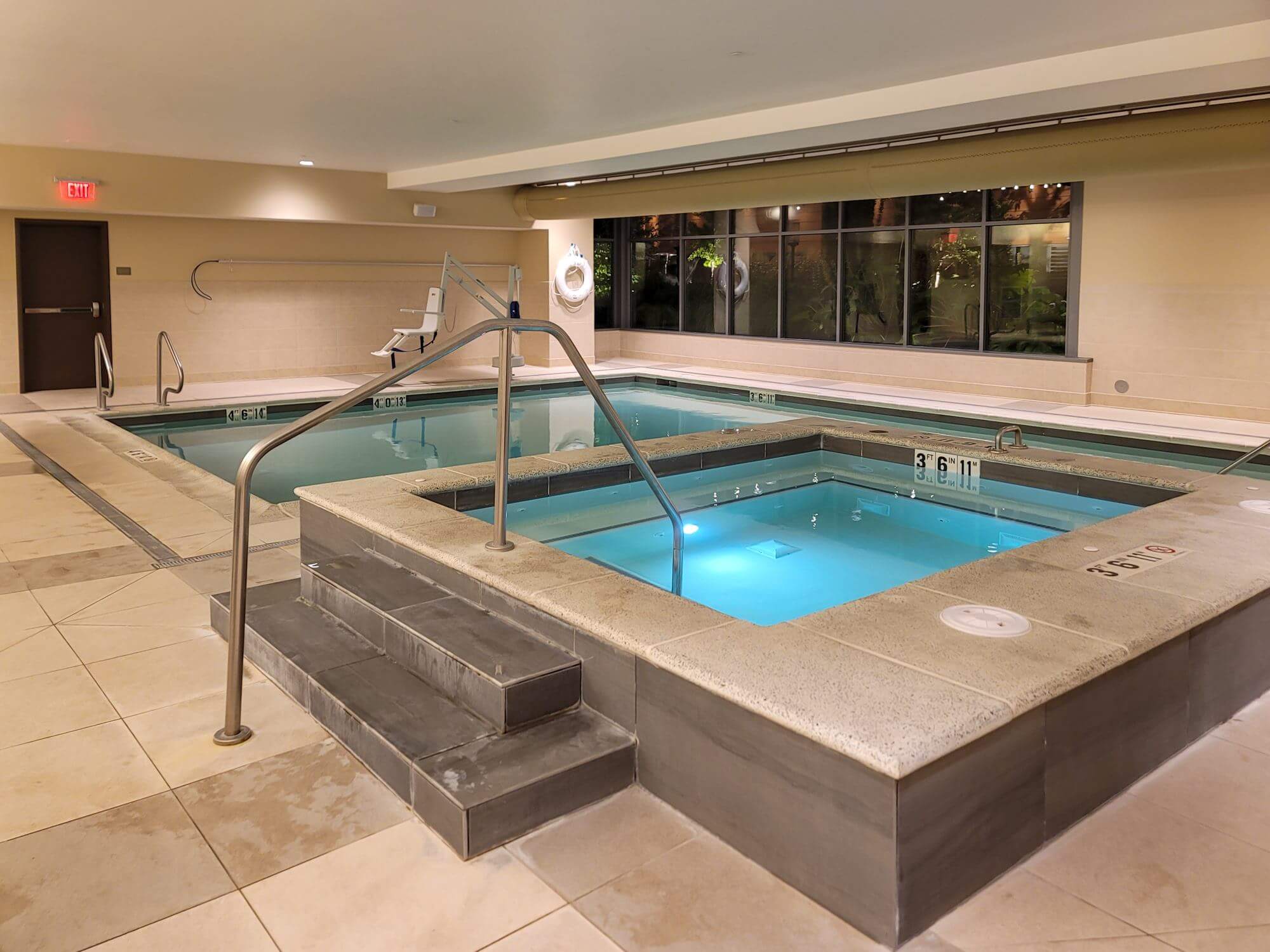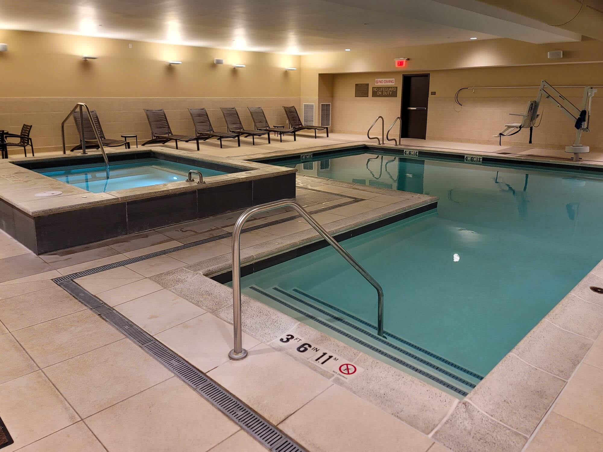 The indoor pool is located next to the fitness center. Your room key is necessary to open the door to the pool area. There are a few chaise loungers inside the pool area. Besides the pool there is also a whirlpool for your enjoyment.