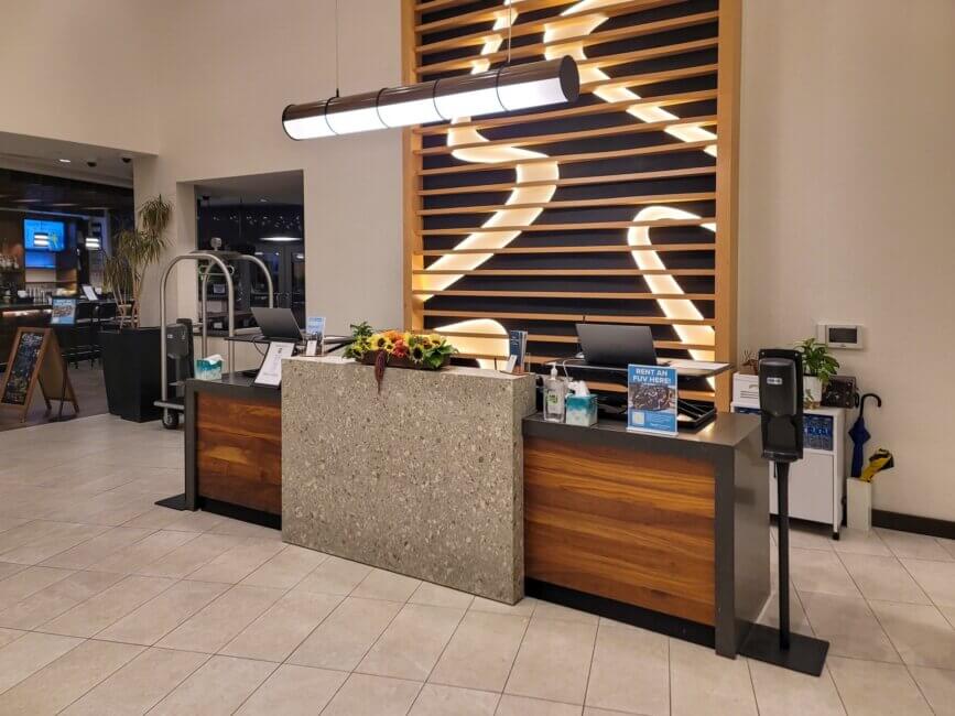 I went upstairs to the fifth floor and the front desk is right in front of you as you walk out of the elevator. You can’t miss it from here. I didn’t know that hotel guests are supposed to park on the fourth floor, and I missed the sign inside the parking garage. The hotel elevators can access parking floors 3 & 4 as well as the floors with guest rooms which are 5, 6 and 7.