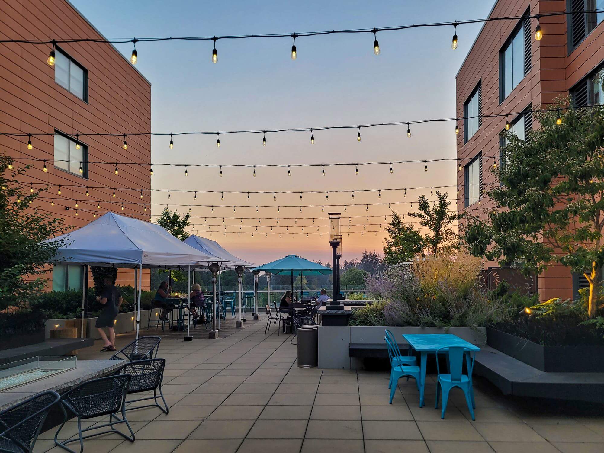 The Sky Deck is part of the Sky Bar. It’s an outdoor patio on the fifth floor. It’s great to hang out and you don’t need to buy anything from the bar to hang out in the area. There is also a small fireplace on the Sky Deck.