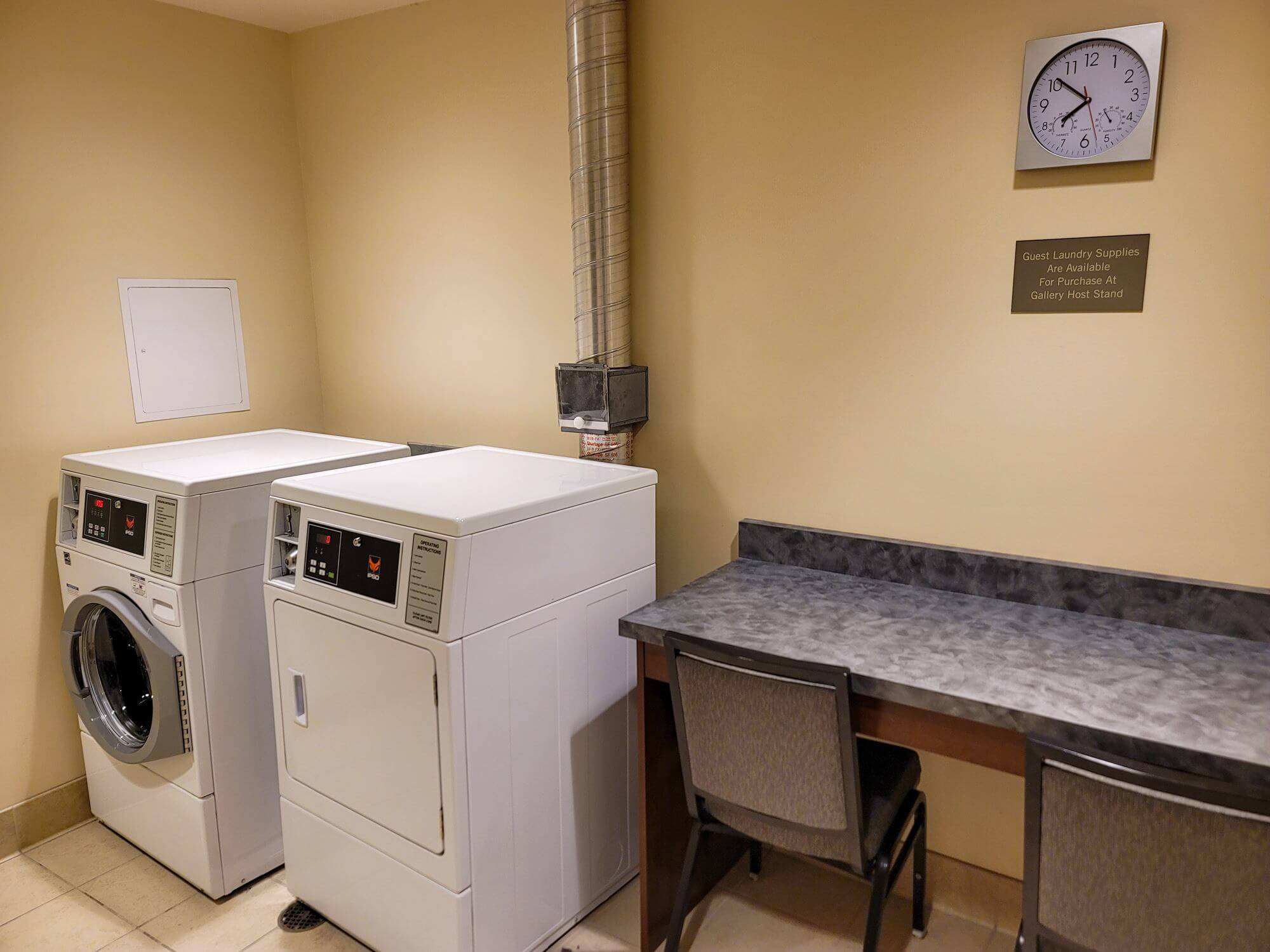 The guest laundry facility is located on the fifth floor as well. Follow the hallway to the left of the Sky Bar and follow the signs. Inside is a single washer and dryer which are coin operated. Unfortunately, the hotel has no dry-cleaning service.