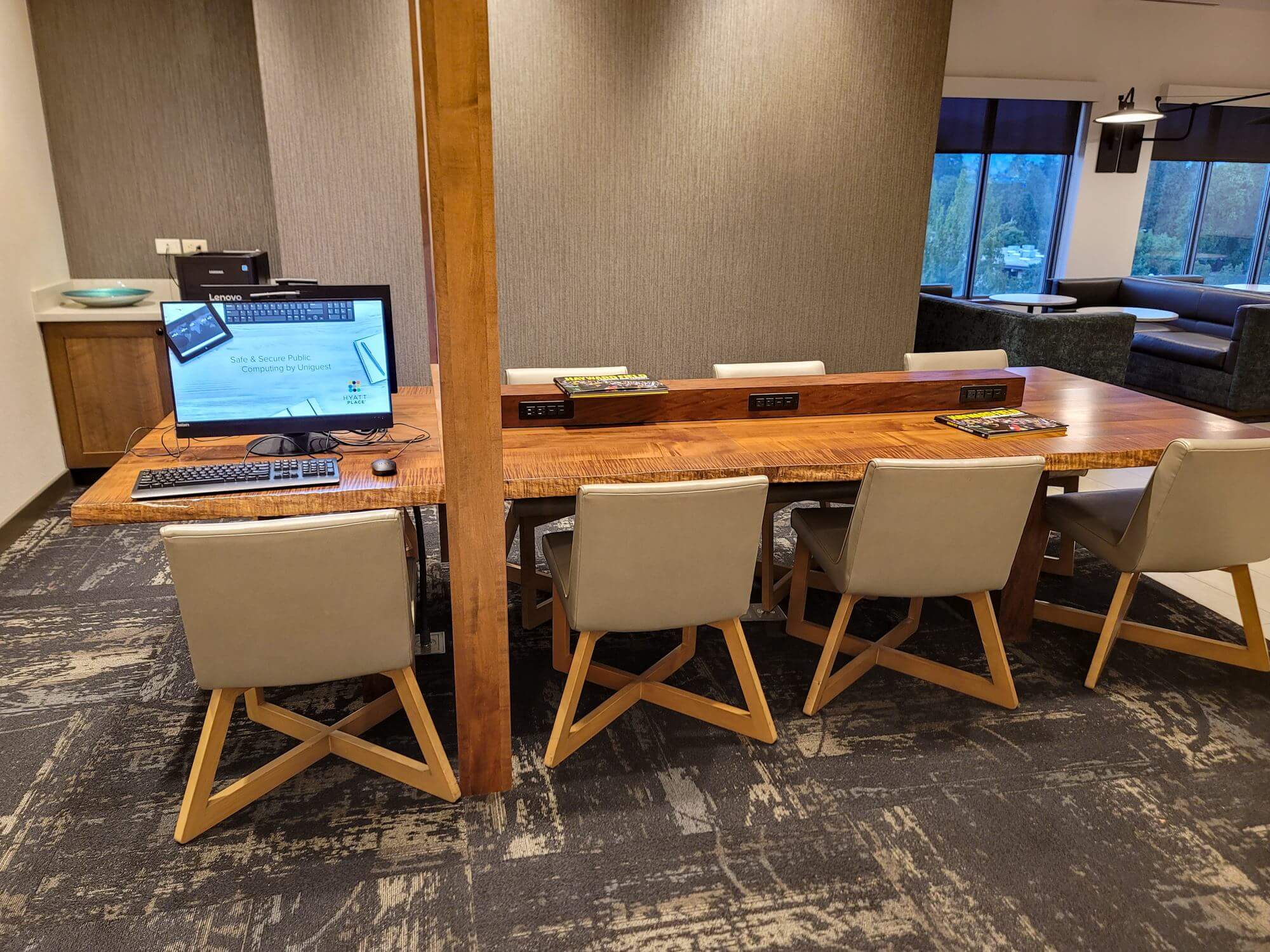 Two workstations and a printer are set up on a desk close to the front desk, near the breakfast dining area.