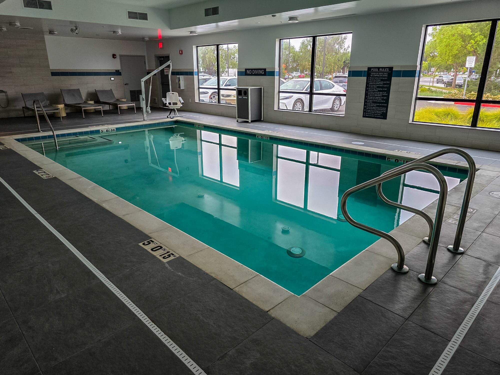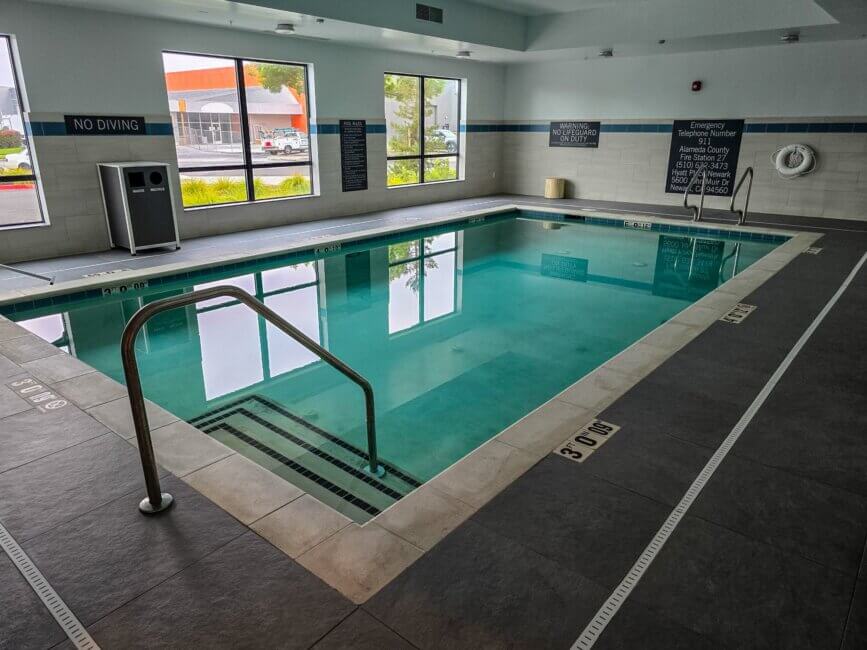 The pool at the Hyatt Place Newark / Silicon Valley is indoors and next to the fitness center. It has its own entrance and you will also need your room key to enter.