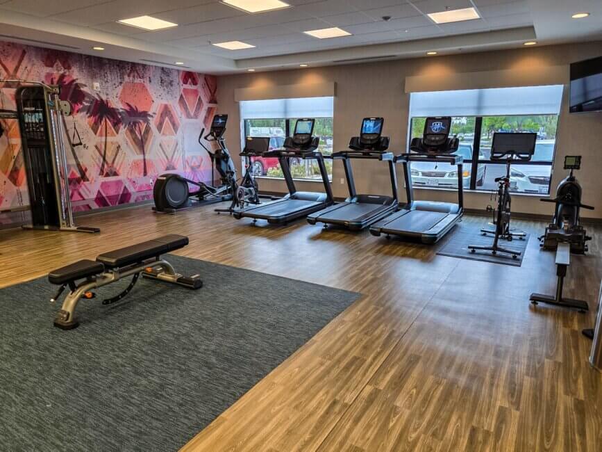 The fitness center is located at the end of the main hallway of the hotel. You need your room key to enter and it has a pretty good workout selection.