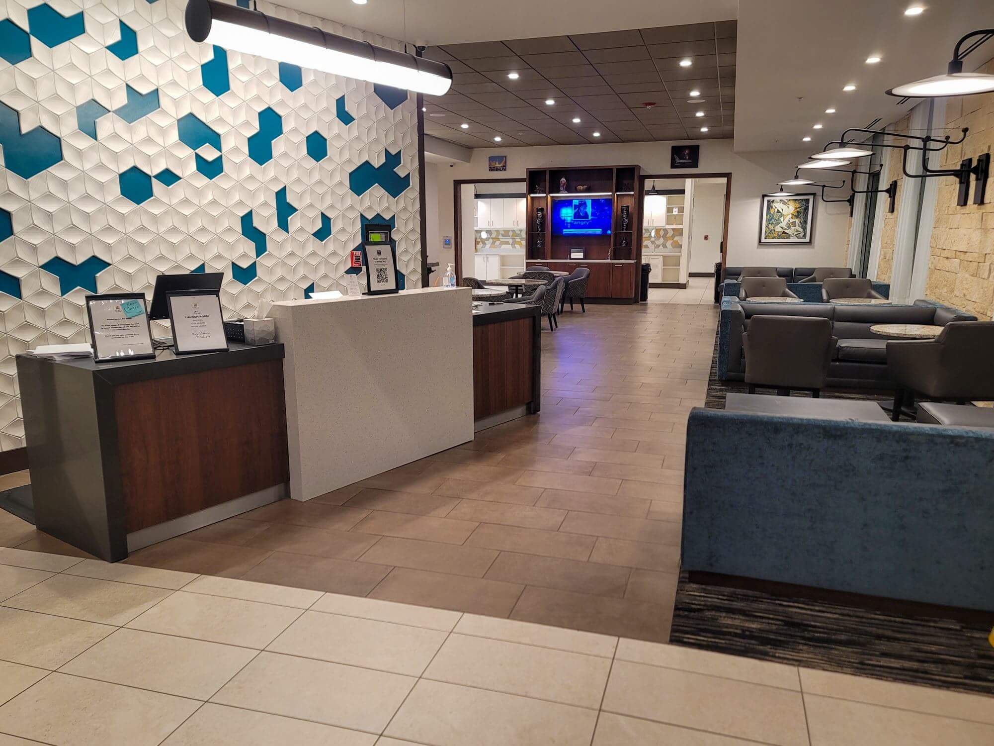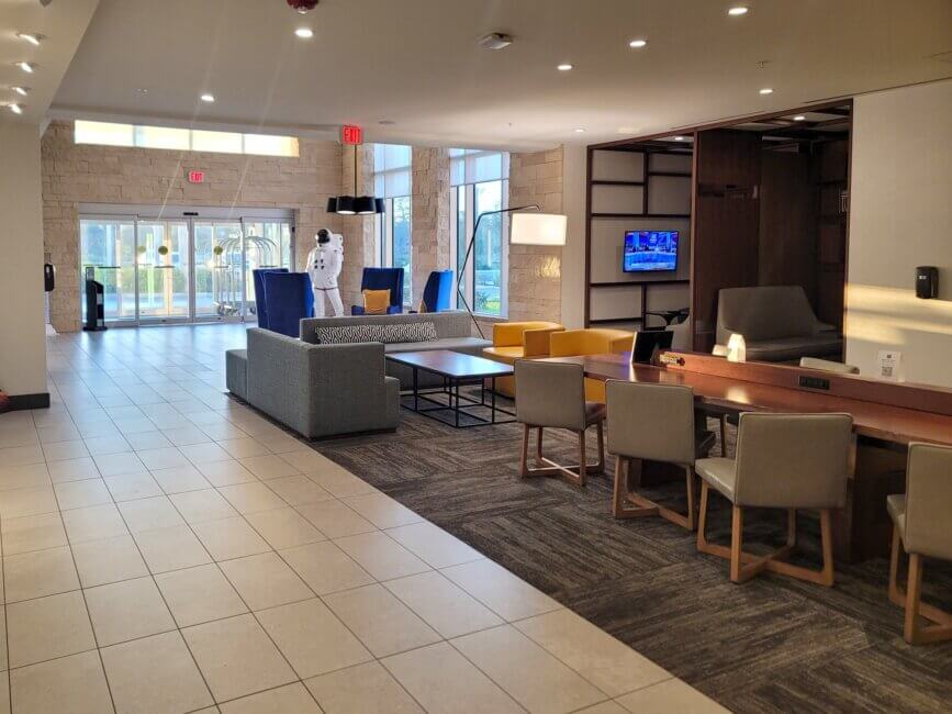 The lobby has a space theme to it with all the posters and astronaut manakins. It’s after all one of the closest hotels to the Kennedy Space Center (Visitor Complex). There are a few seating options near the front desk.