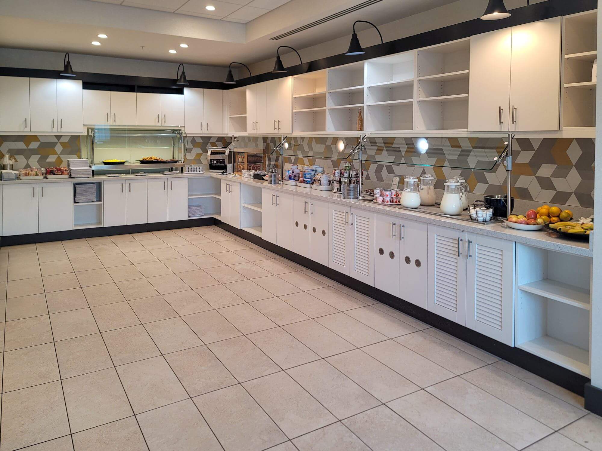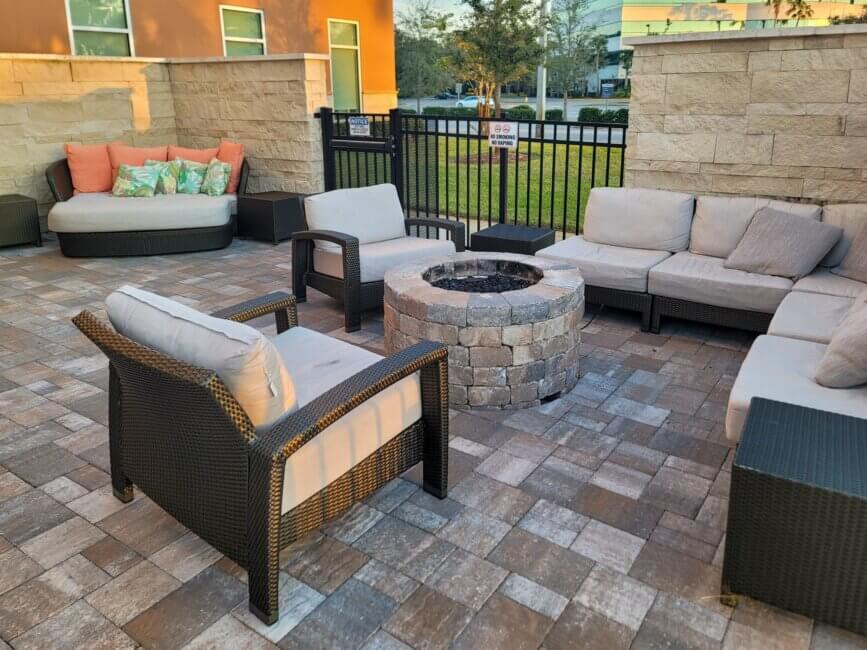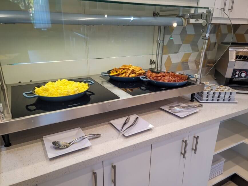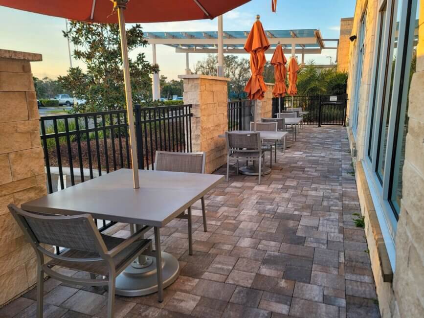 Breakfast is served in the room next to the lobby bar. You can’t miss it in the morning. The buffet setup is typical for a Hyatt Place property. You get some good choices but nothing spectacular. However, there might be a chance that you run out of seating space in the breakfast area. People also started sitting down in the bar area as well as at the big table of the business center. There are a few more dining tables located just outside the breakfast room. To get back in, you need your room key. The door to get back in is a bit tricky. After you tap your room key, wait for the noise to stop before pulling on the door. Otherwise, it won’t open. This outdoor dining patio space also comes with a fireplace.