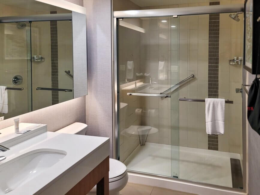 Opposite the bed is a closet. Inside you find an iron, an ironing board, and an in-room safe. Next to the closet is a dresser with drawers which also houses a mid-sized refrigerator. Above the dresser is a wall-mounted TV that swivels so you can watch it comfortably from the sofa bed or bed itself. Next to the dresser is a work desk with an office chair. On top of the desk is a lamp as well as a coffee maker and an in-room phone.