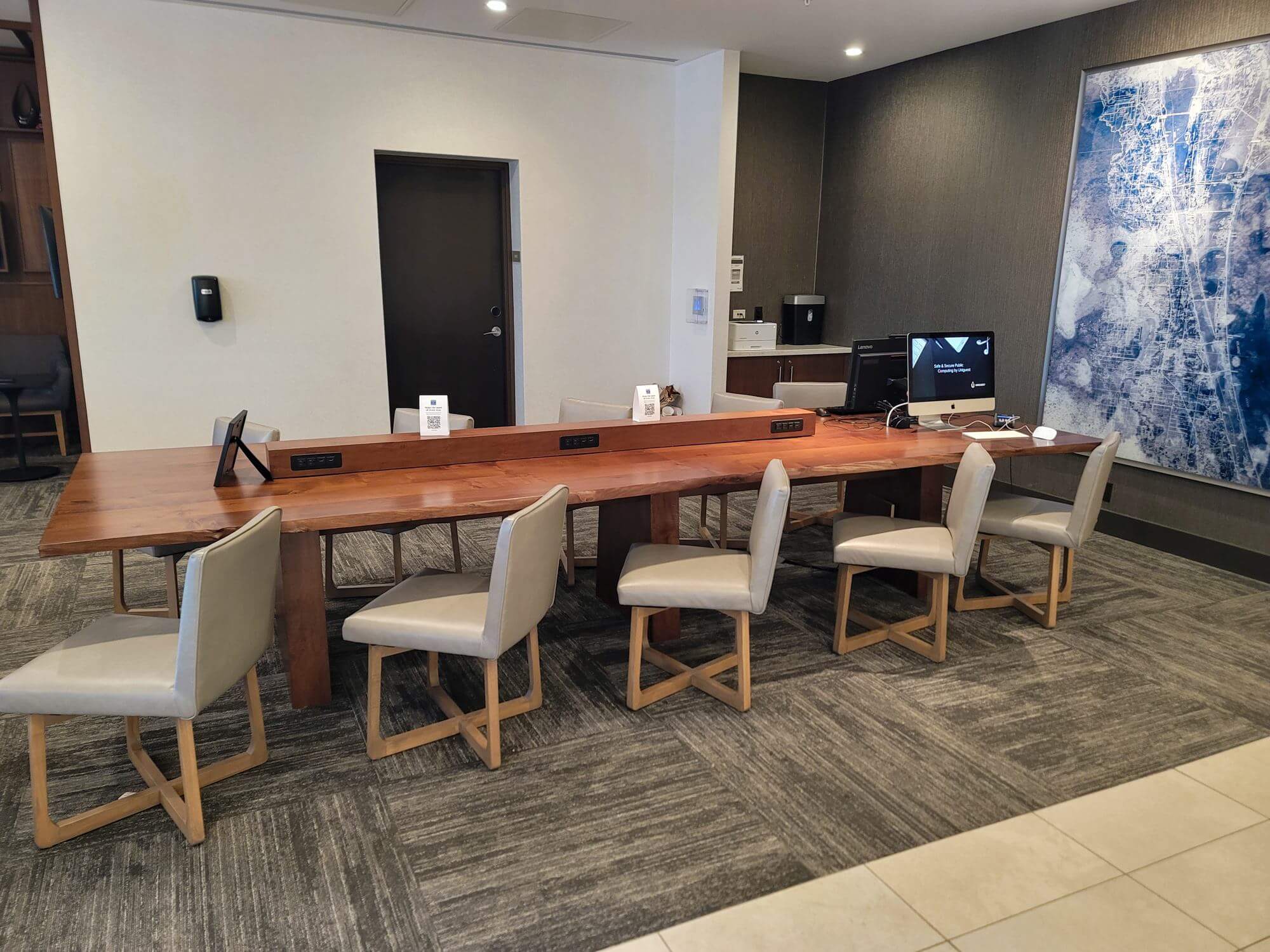 The Business Center is a bigger part of the lobby space. There is a large desk where you can set up or use one of the existing computer terminals. A printer is available as well.