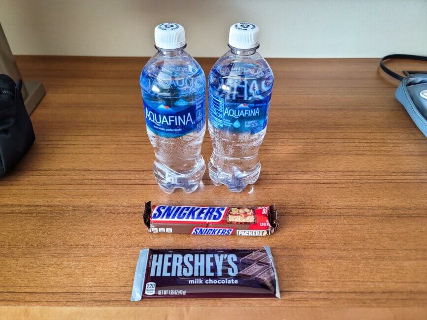 I arrived at the airport at 7 a.m. and after I got my bag and car, I called the hotel to ask if I could do an early check-in. The agent on the phone told me that they had a room available and that I could check in at any time. After about 45 minutes I arrived at the hotel and was able to check in just as promised. It was a quick and easy check-in. The lobby was packed with people still enjoying their breakfast while I checked in. As a welcome amenity, I received two bottles of water and some candy. The candy part is new. Usually, I just get the water. That was a very nice and memorable touch.