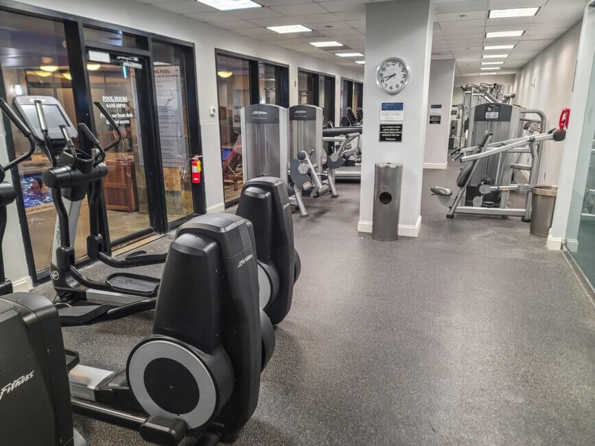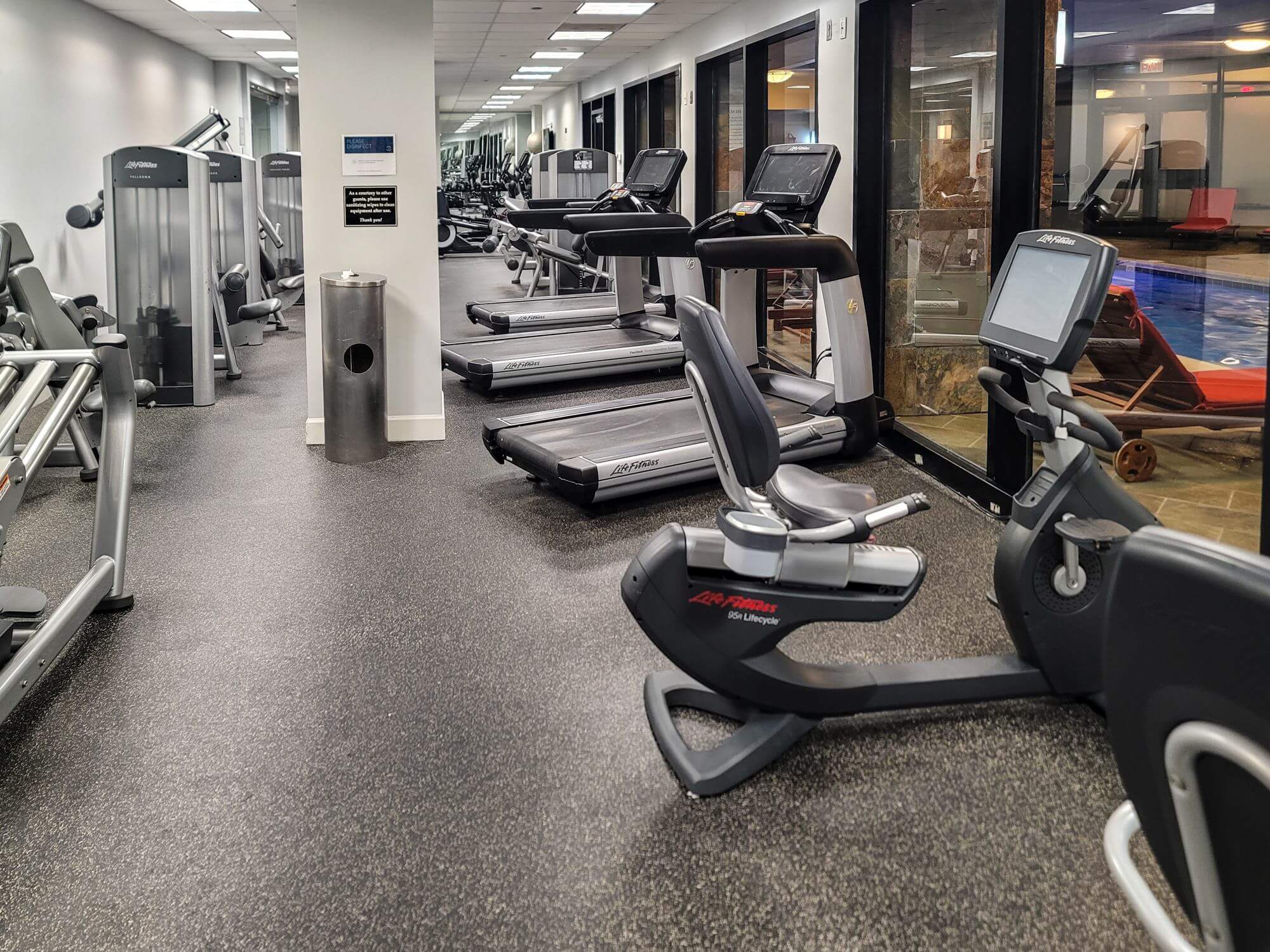 The fitness center is large and has a ton of workout equipment. It overlooks the indoor pool area.